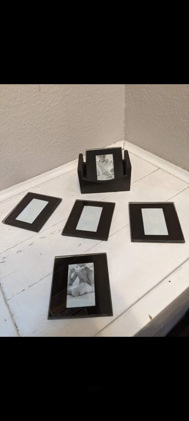 Selling a set of five picture frame coasters in black! They come with a convenient holder to keep them organized and ready for your next gathering. These coasters are perfect for adding a personal touch to your coffee table or bar area, allowing you to display your favorite memories while protecting your furniture