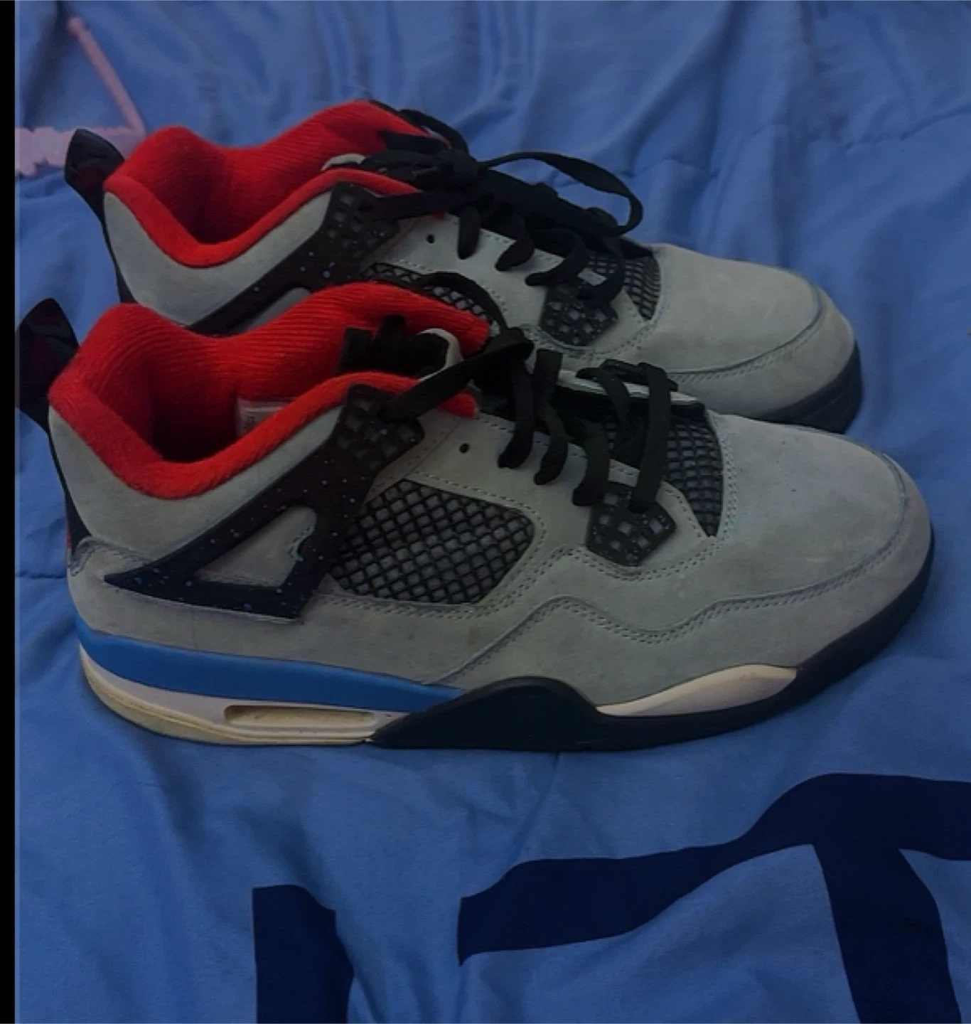Selling a pair of Jordan 4 Retro Travis Scott Cactus Jack sneakers in a US size 10. These have a unique design with the Cactus Jack branding. They show some signs of wear, as seen in the photos. (Pick up only)