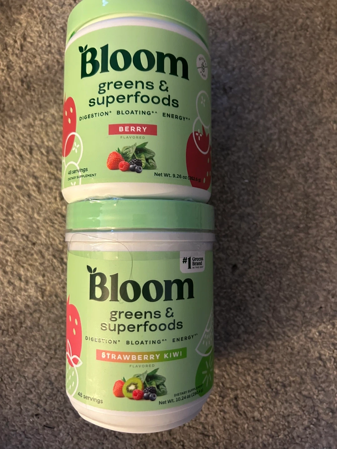 I have two containers of Bloom Greens & Superfoods. One is Berry flavored and the other is Strawberry Kiwi flavored. Both containers are 48 servings and dietary supplements. Enjoy the benefits of digestion, reduced bloating, and increased energy!