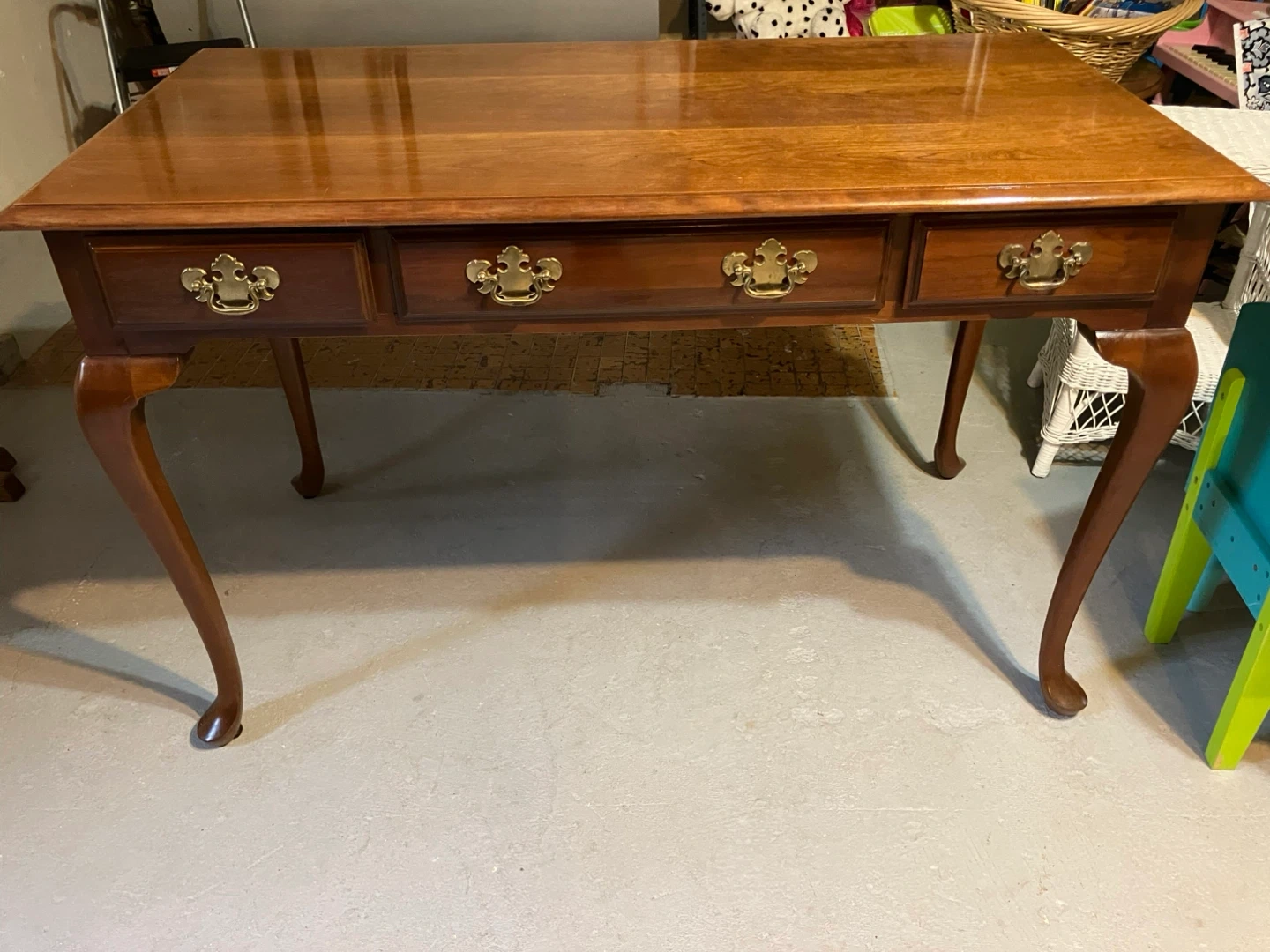 Selling a lovely vintage wooden desk with three drawers. It's a beautiful piece that would add character to any room. The desk is in good condition and ready for a new home!