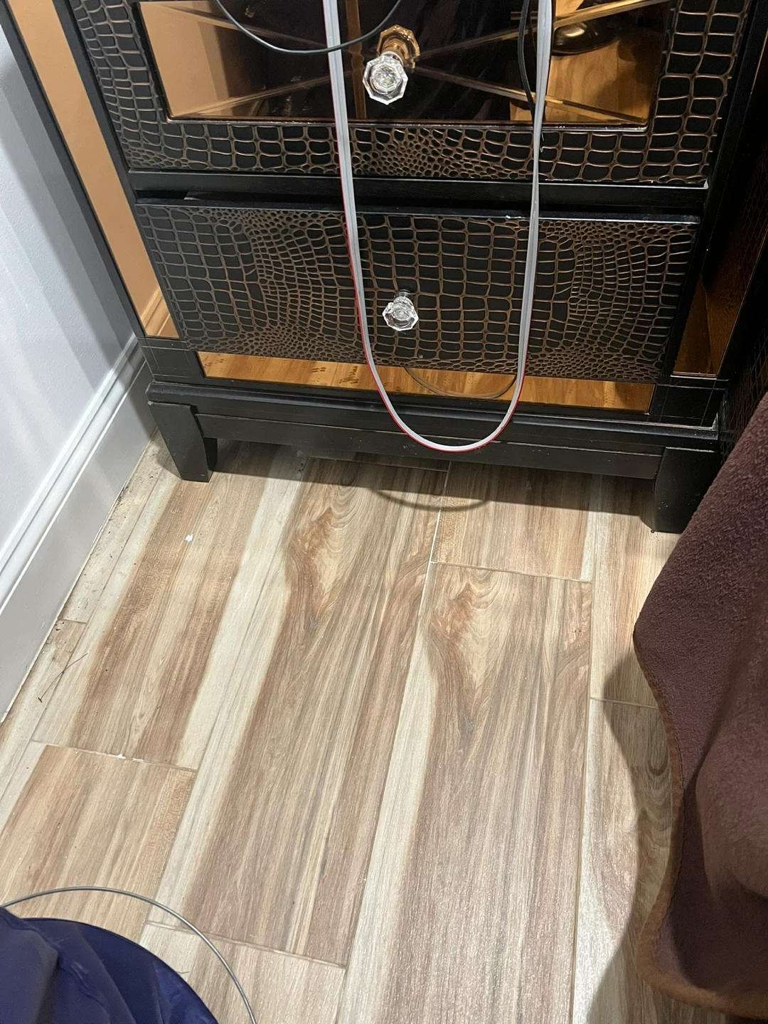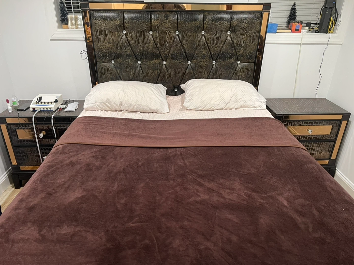 Selling a bedroom set that includes a dresser with a mirror, two nightstands, and a headboard. The set has a unique crocodile-like pattern and gold accents, adding a touch of luxury to any bedroom. The drawers offer ample storage space, and the nightstands are perfect for bedside essentials. This set is perfect for anyone looking to upgrade their bedroom furniture!