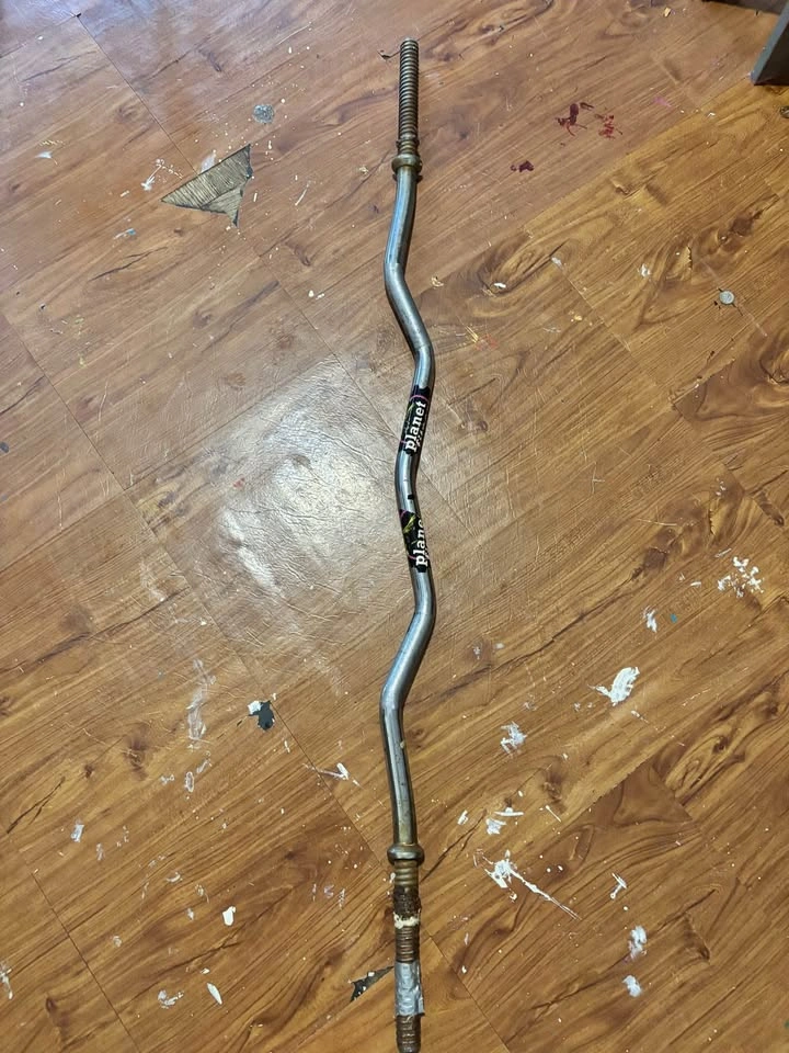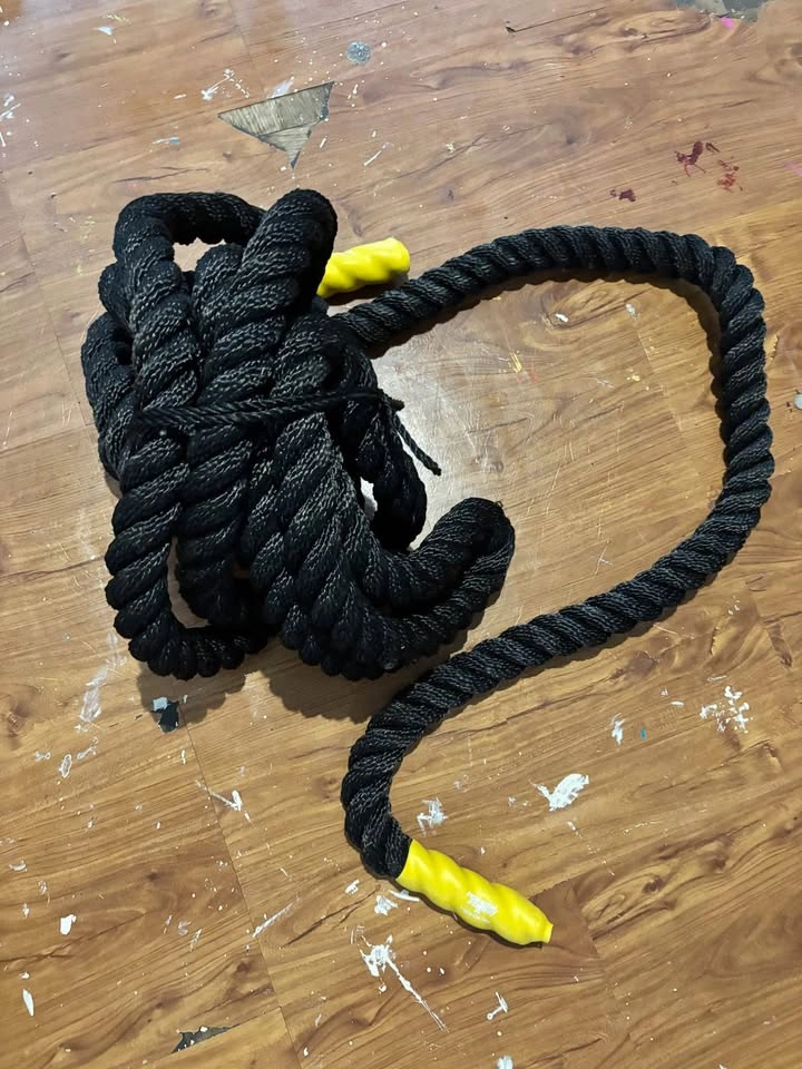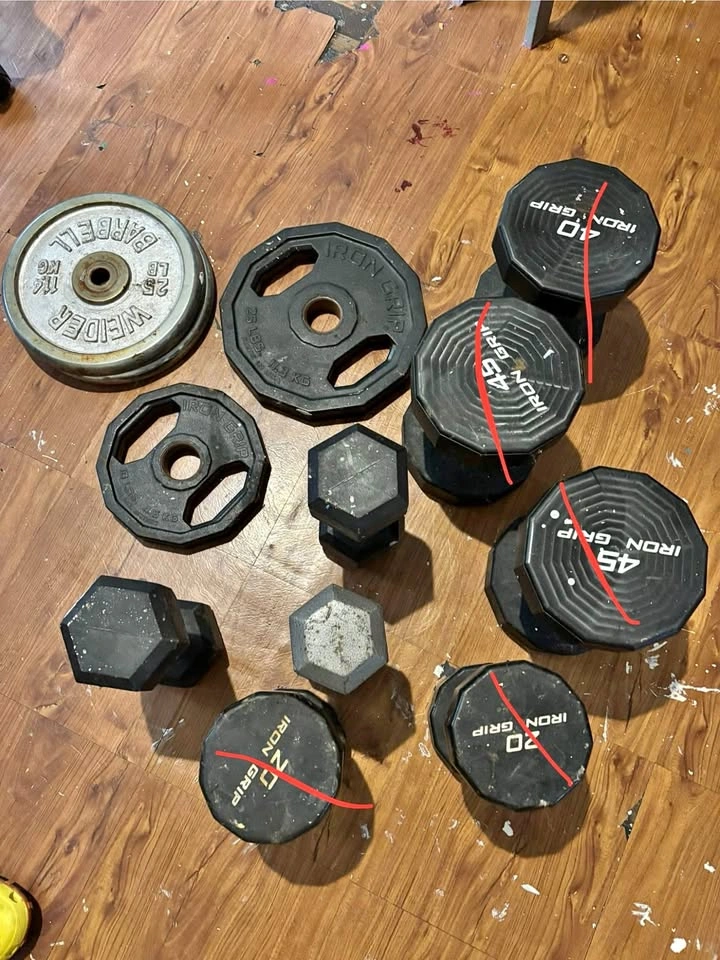 81$10 - barbell collars $40 - each of set of dumbbells and bar weights (20lbs, 40lbs & 45lbs sold) (2 sets of 20lbs left along with bar weights) $40 - workout ropes free - curl bar all weight have their pair. Used weightlifting equipment for sale. Includes various weight plates with weights of 10lb, 45lb, 25lb, and 20lb. The battle rope is black with yellow handles.