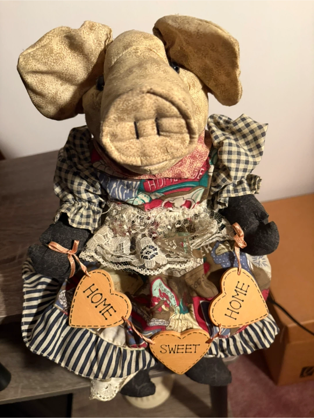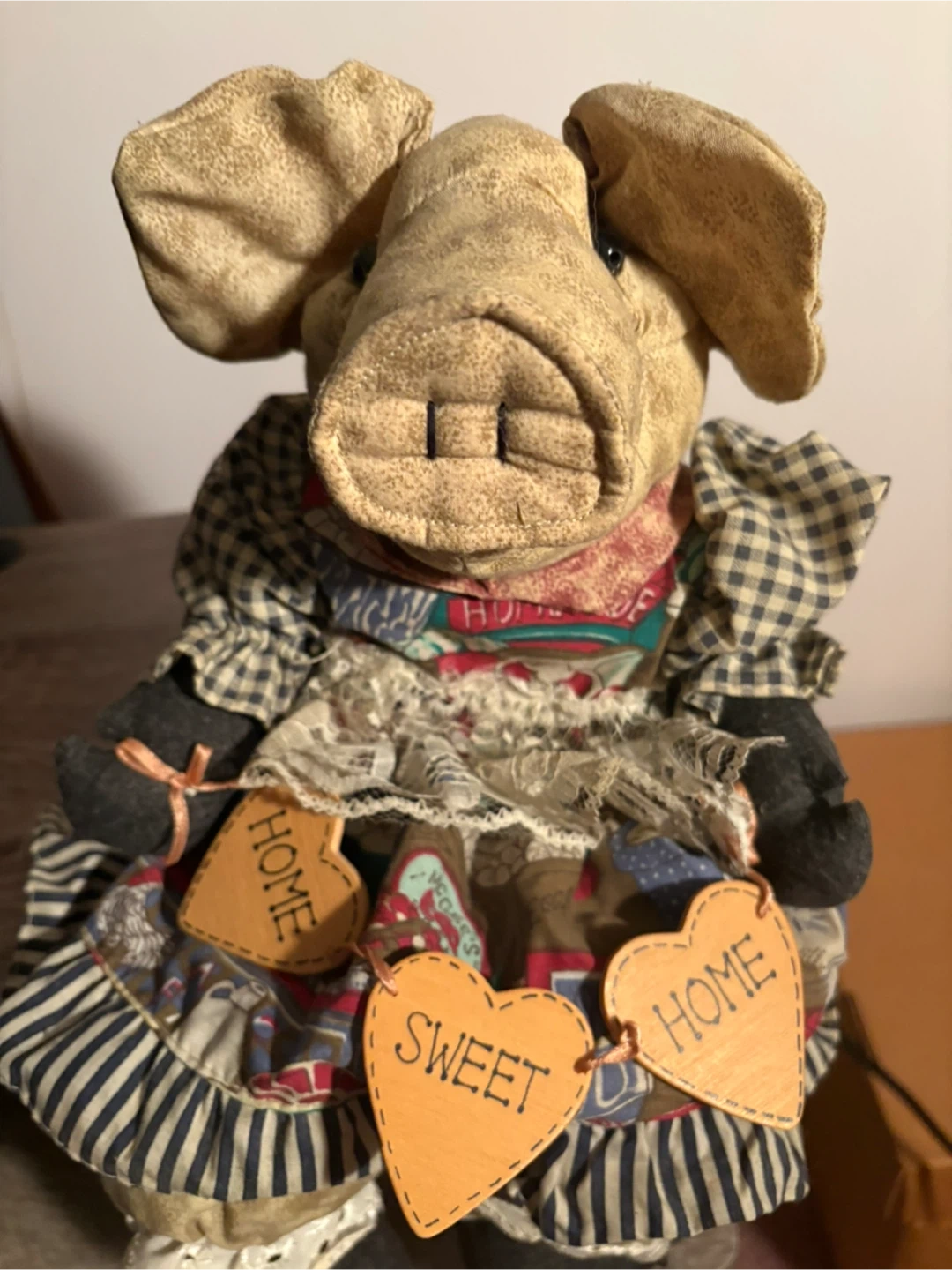This pig is a sill sitter dressed in a cute outfit and has wooden hearts that say 'Home' 'Sweet' 'Home'. Can be seated anywhere and stays put.