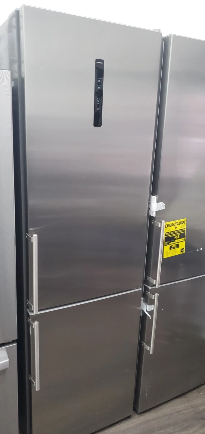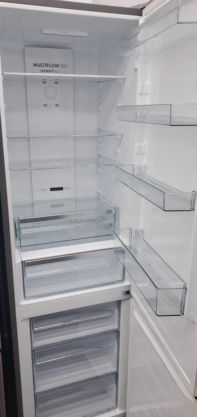 Selling a stainless steel refrigerator. It features a multi-airflow system and a no-frost plus design. The interior has adjustable shelves and drawers for flexible storage options. New floor sample. Delivery and warranty available