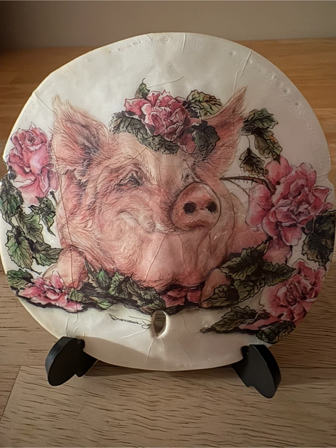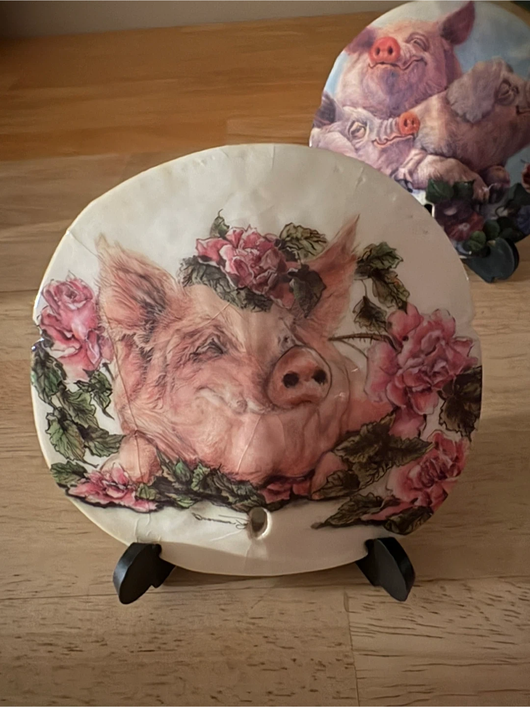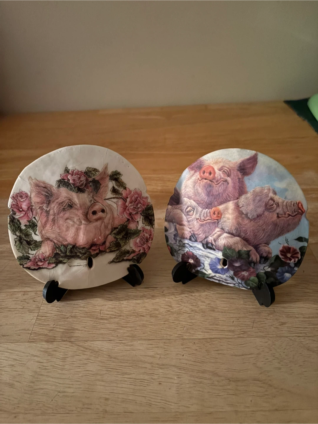 I'm selling a set of decorative pig sand dollars . They come with stands, ready to be displayed in your home. These feature charming pig designs surrounded by floral accents. They're in great condition and would make a lovely addition to any collection!