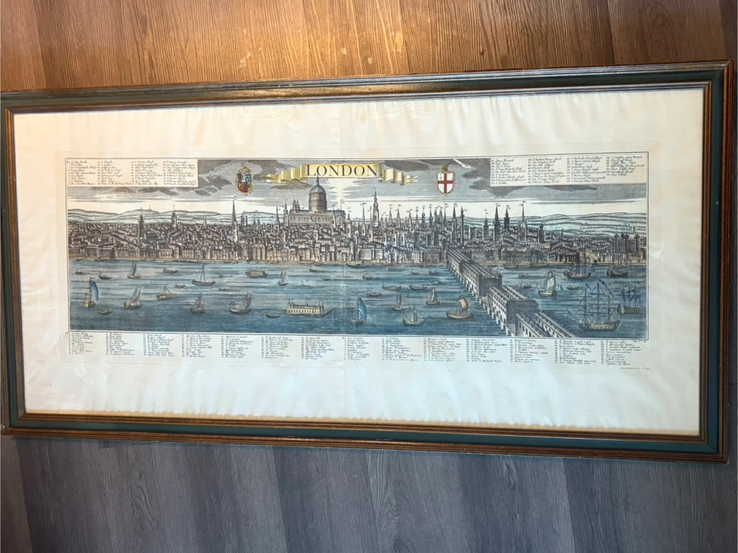 Gorgeous antique map of London! This is a framed reproduction of an antique panoramic view of London, originally created by German printmaker Georg Balthasar Probst around 1730-1760. The print is a "birds' eye view" of London after the Great Fire of 1666, showing the city's major buildings, houses, and churches. St. Paul's Cathedral is a prominent feature in the skyline, and London Bridge is shown with houses along its entire length. The Thames River is depicted as being busy with numerous boats and ships. The original artwork often includes a key in both German and English, identifying the various landmarks. The framed artwork is approximately 15.75 inches by 44.25 inches. There are no water stains on the image, it's shadowing from the overhead lighting.