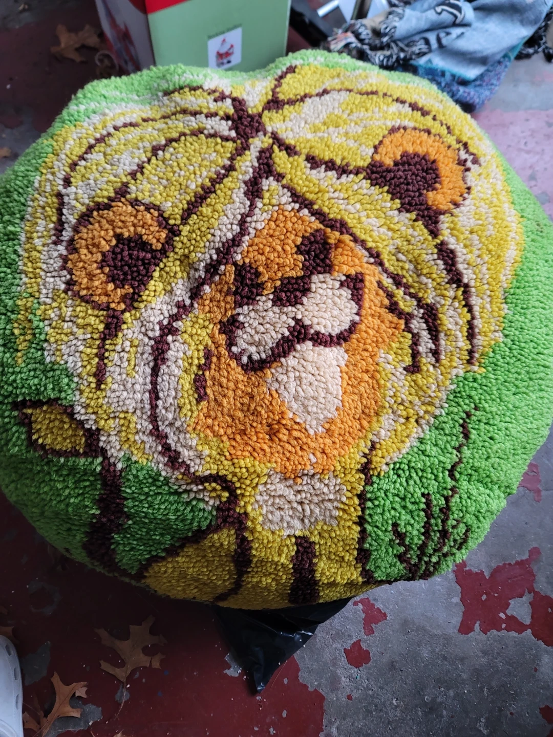 18This is a round floor cushion featuring a tiger face design. The top is a colorful, textured tiger pattern, while the bottom is a solid tan color. It's perfect for adding a fun, cozy touch to any room pick up in Merrick Ny CASH ONLY