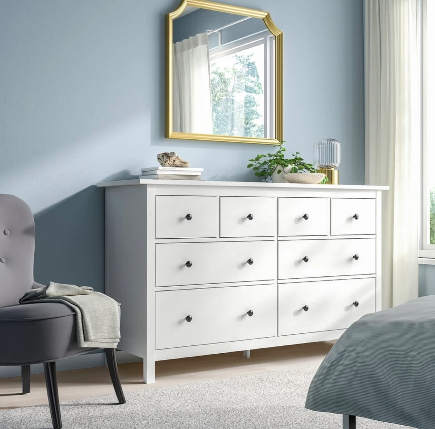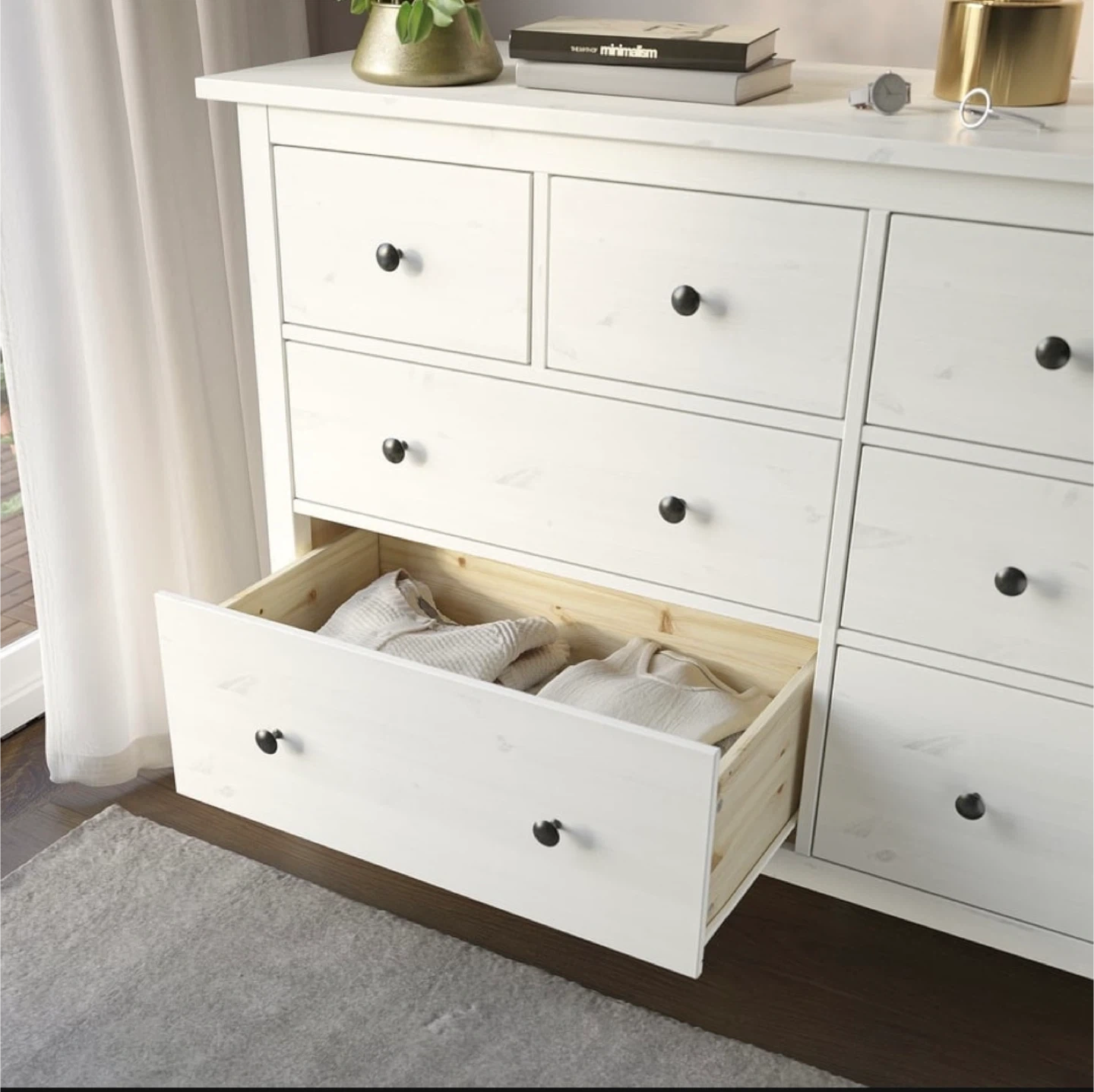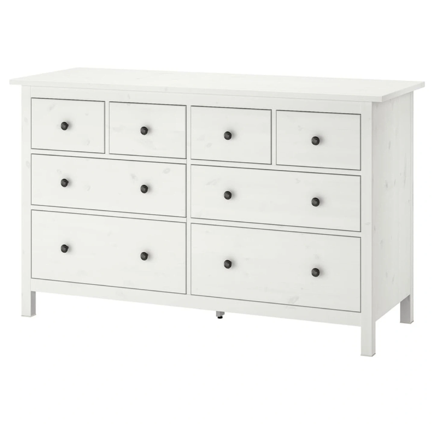 Selling a white IKEA dresser! It features eight drawers with black knobs, providing ample storage space.