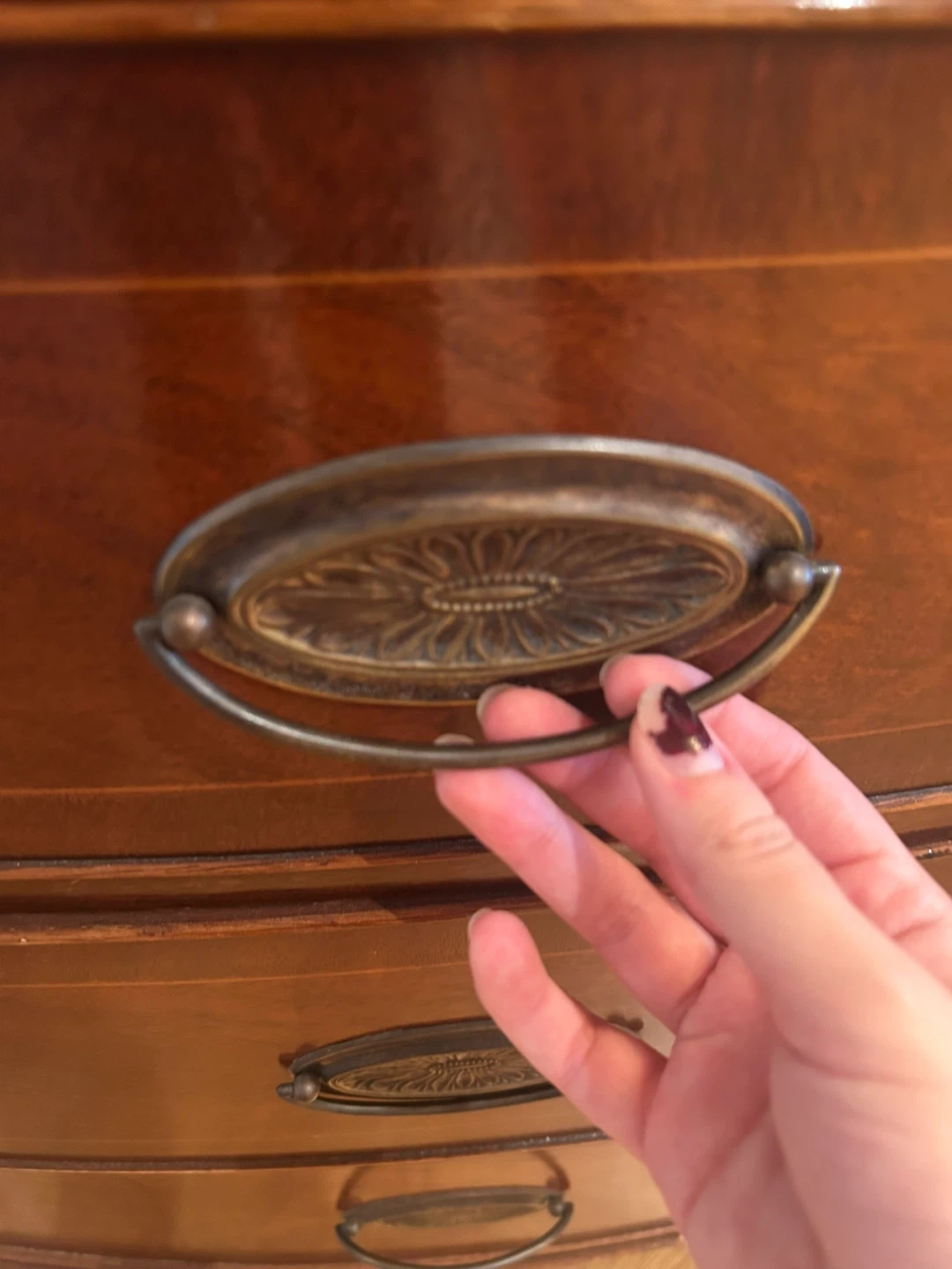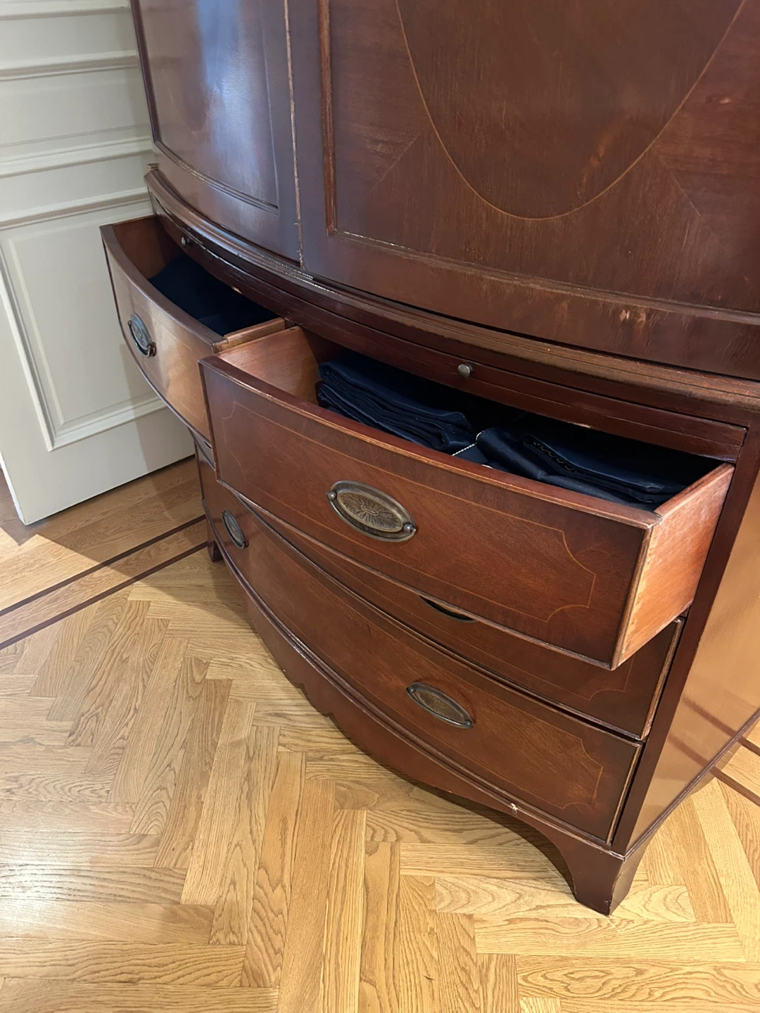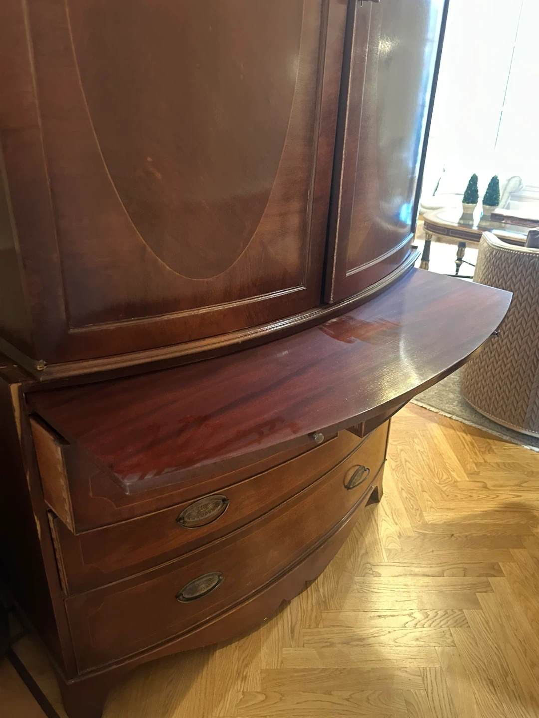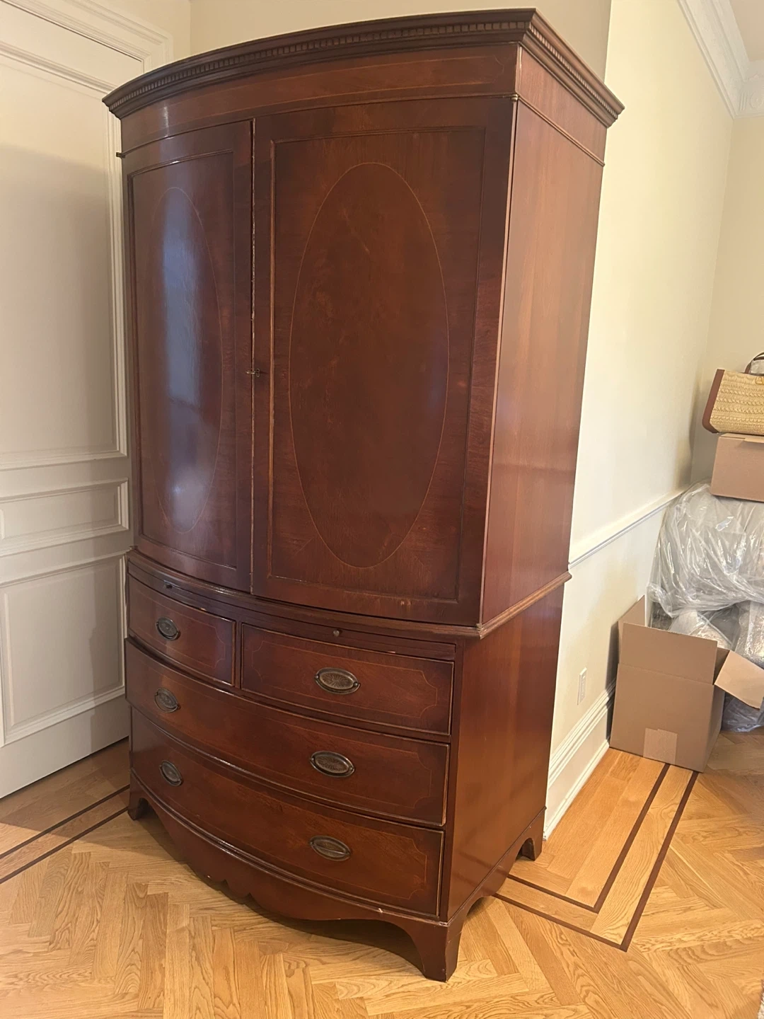This is an antique George III Mahogany Linen Press. There is ample storage space, 2 big drawers and 2 smaller drawers. There is also a pull out wooden press. There is a lock & key, but It does not work. This is solid Mahogany wood: Measurements are 84.5” Tall, 47” wide, and 25” deep.