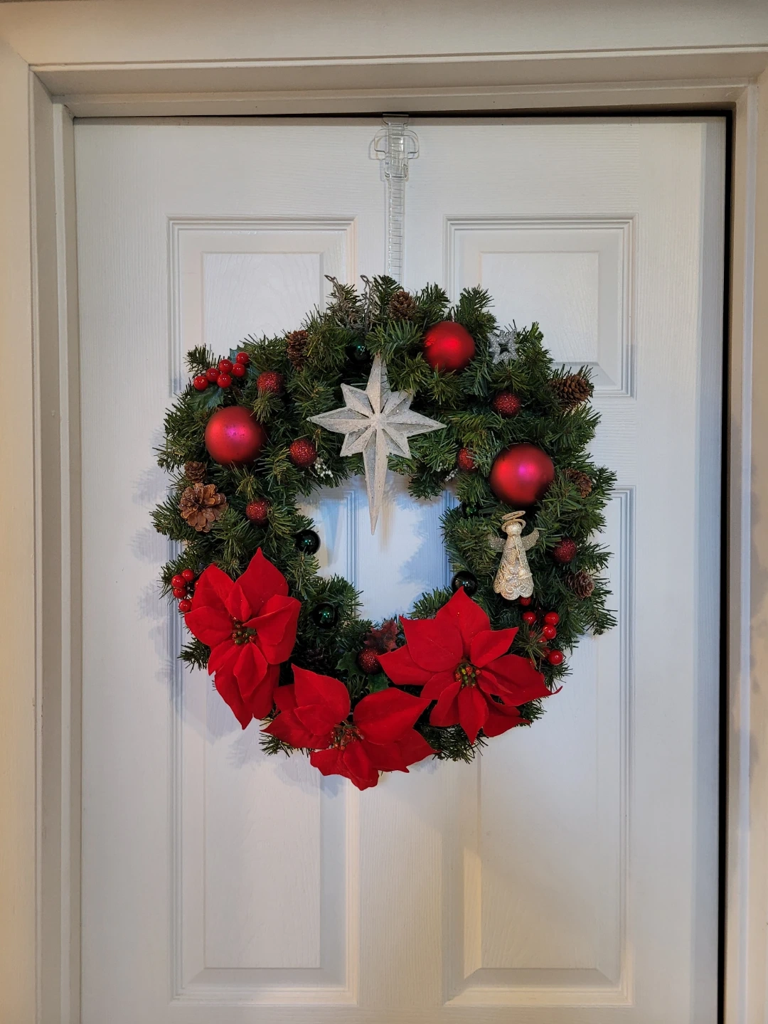 Festive Christmas wreath featuring vibrant red poinsettias, shiny red ornaments, pinecones, angel and a sparkling star. Perfect for adding a touch of holiday cheer to your door or wall this season.