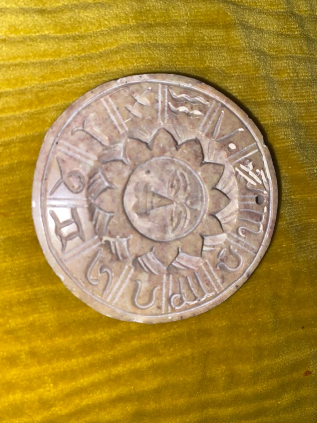 65Decor Piece—Beautiful carved medallion featuring the sun surrounded by zodiac symbols. Has a warm, ancient energy — perfect for altar spaces, meditation corners, or astrology lovers. Made of stone/resin with detailed engravings that give it a celestial, timeless feel. ✨ Great condition, never used for rituals 📏 Palm-sized