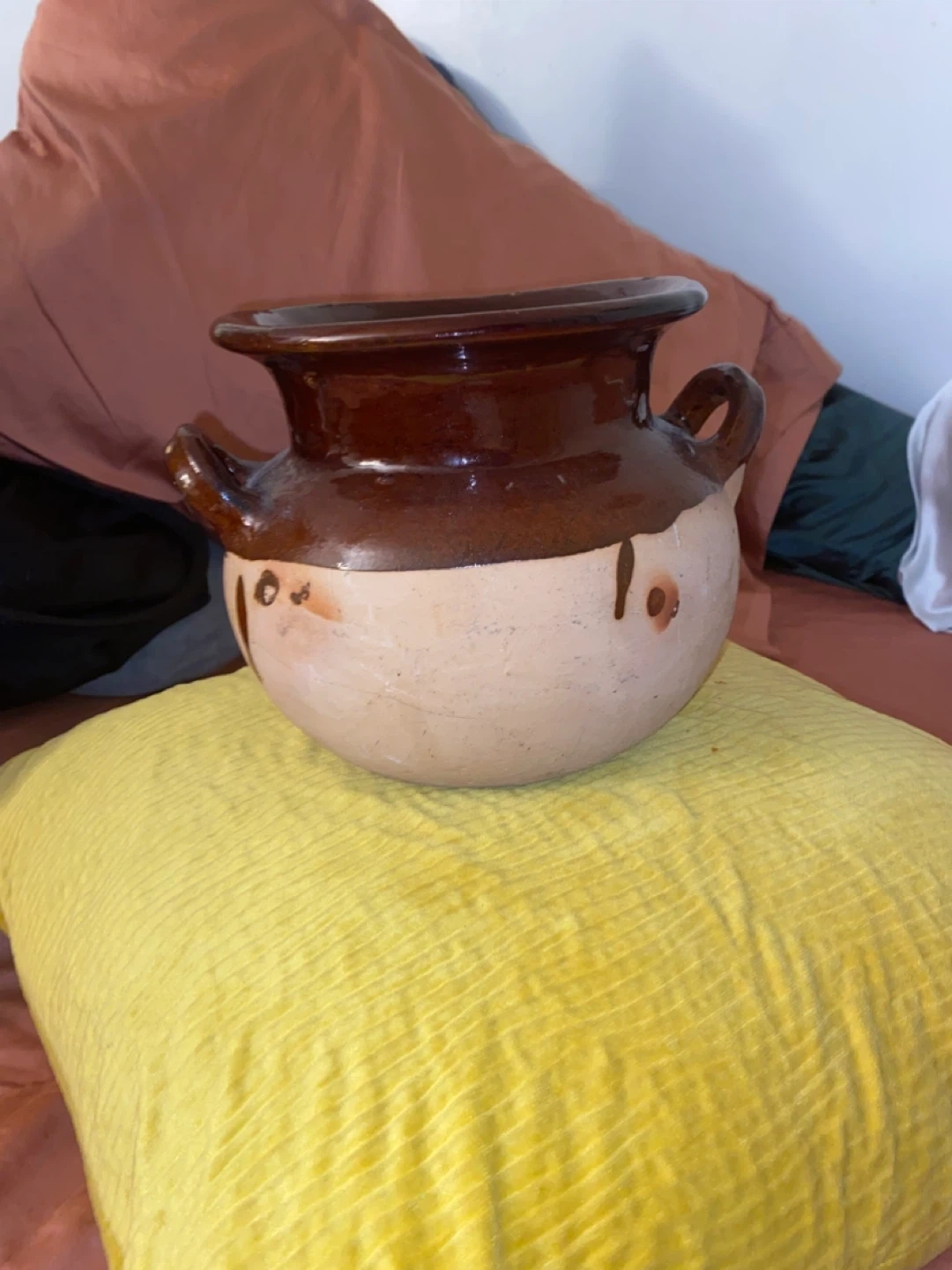 65Selling a vintage brown pottery vase. It has a two-tone design with a darker brown glaze on top and a lighter, natural clay color on the bottom. The vase features two small handles and measures approximately 5 inches in height. It would be a lovely addition to any home decor!