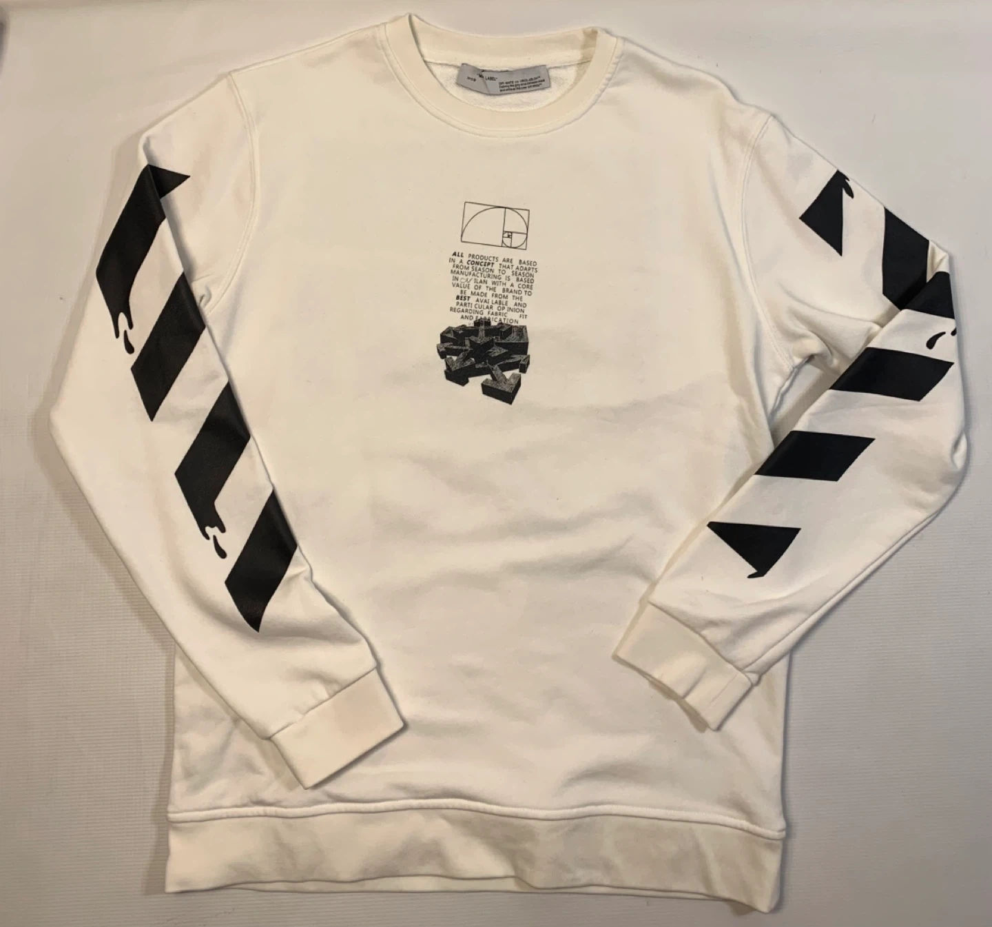 111Selling a white long sleeve shirt from Off-White. It features the brand's signature diagonal stripe design on the sleeves and a graphic print on the front and back. The shirt is made of a comfortable material, perfect for casual wear