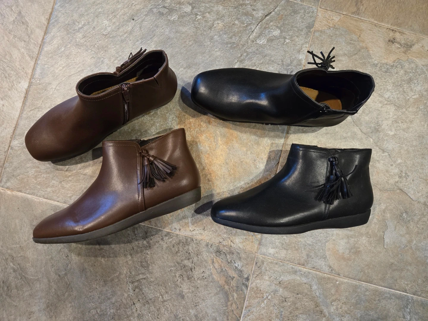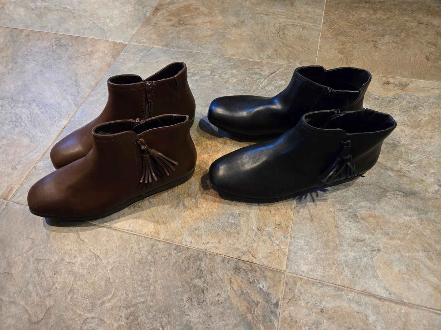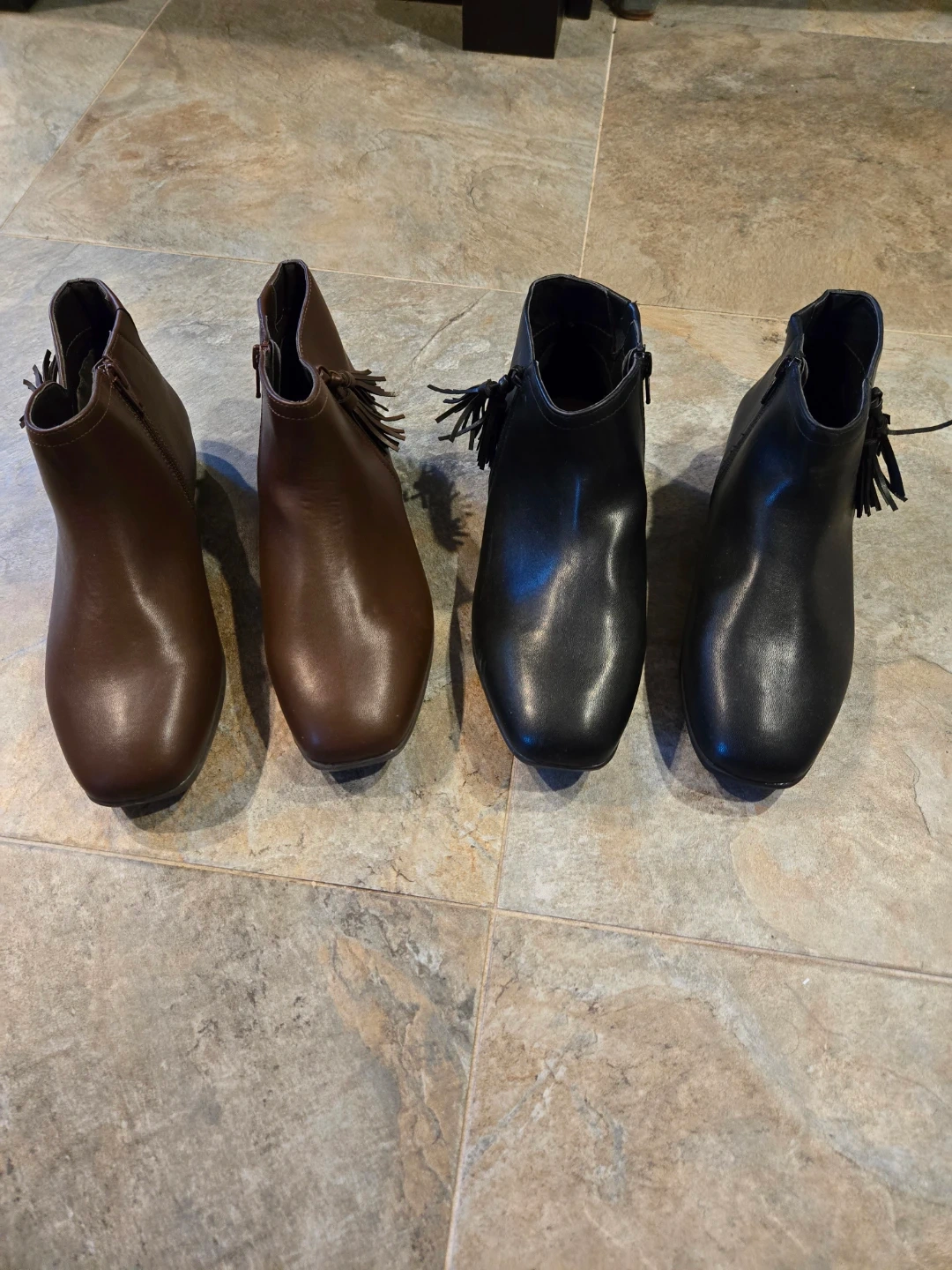 Here are two pairs of ankle boots, one in brown and one in black! They both have a cute tassel detail and a convenient zipper closure. Perfect for adding a touch of style to any outfit