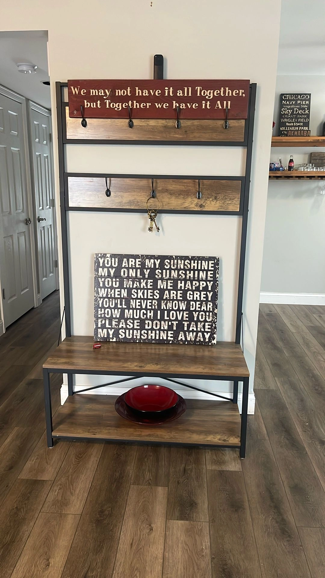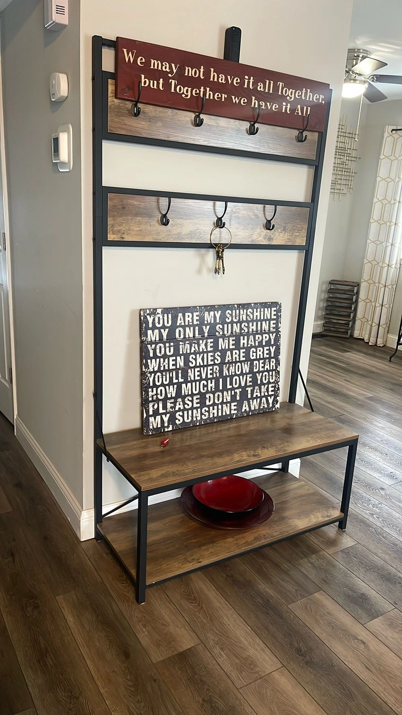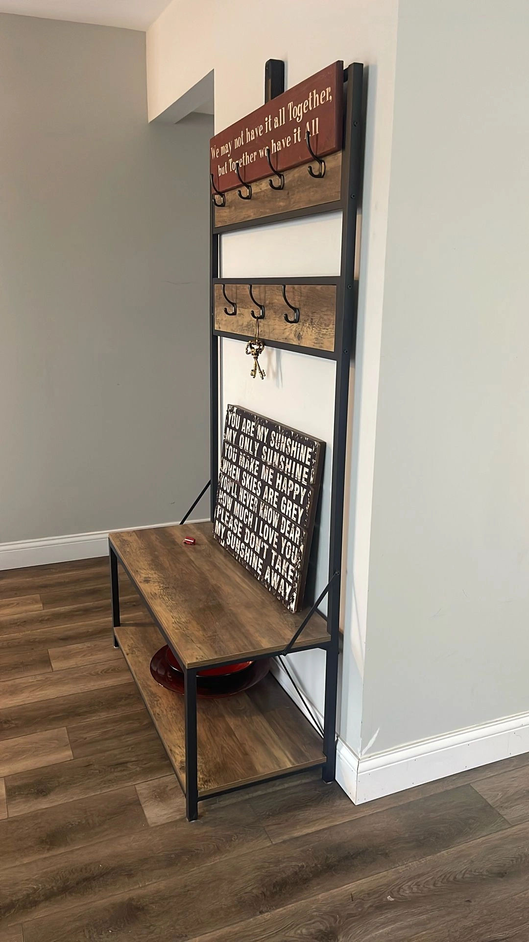 0Beautiful 40” rustic industrial hall tree bench in excellent condition. Perfect for entryways, mudrooms, or apartments. Includes: • Sturdy metal frame • Wood bench • Storage shelf underneath • Multiple hooks for coats, keys, bags • Decorative signs not included (bench only) Solid, stylish, and functional. Ready for immediate pickup. Message to schedule pickup.