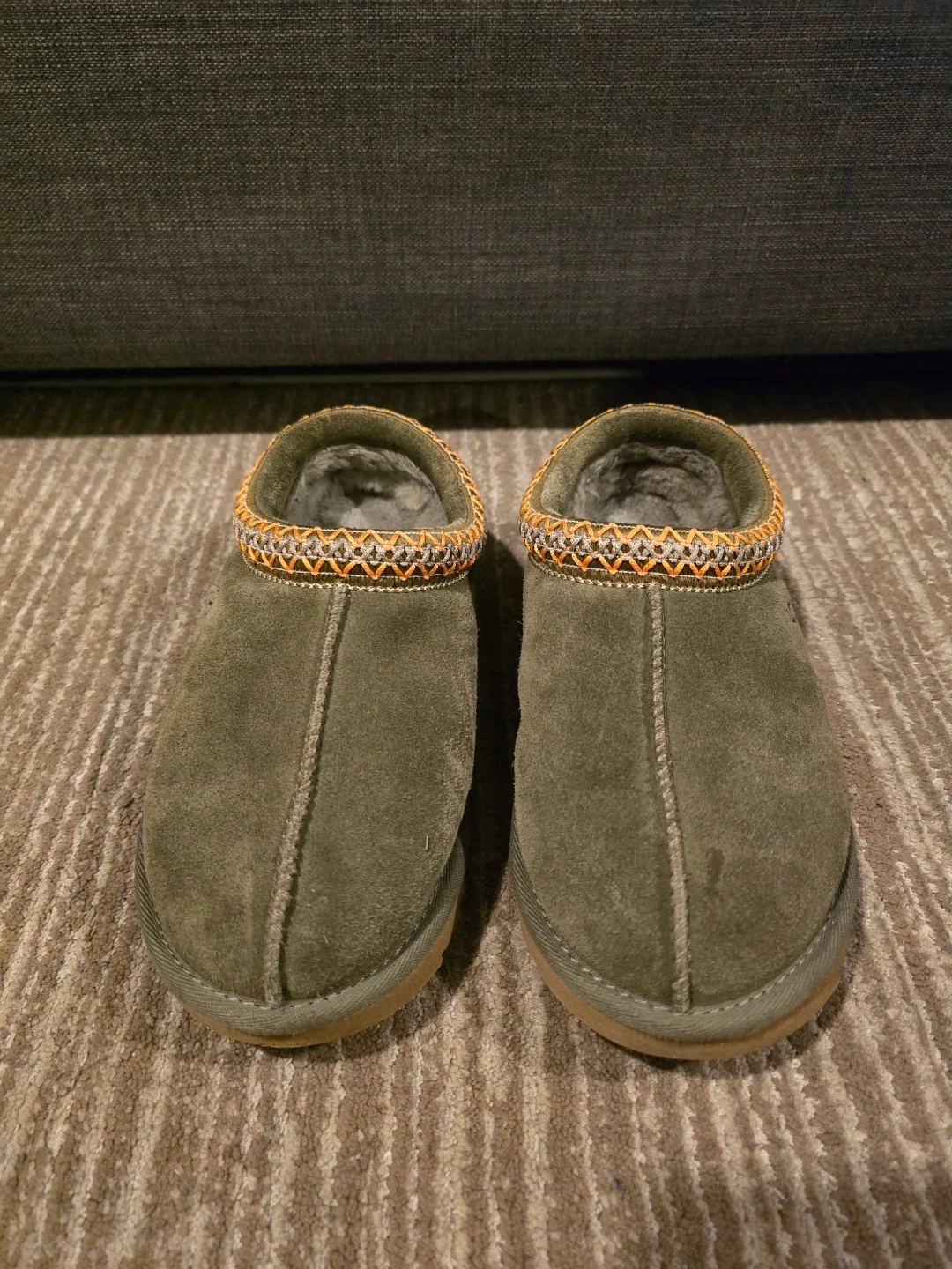 Cozy UGG Tasman slippers in a beautiful olive color! These slippers are perfect for keeping your feet warm and comfortable around the house. They feature a suede upper and a plush sheepskin lining. The size is women's. They are in great condition and ready for a new home!