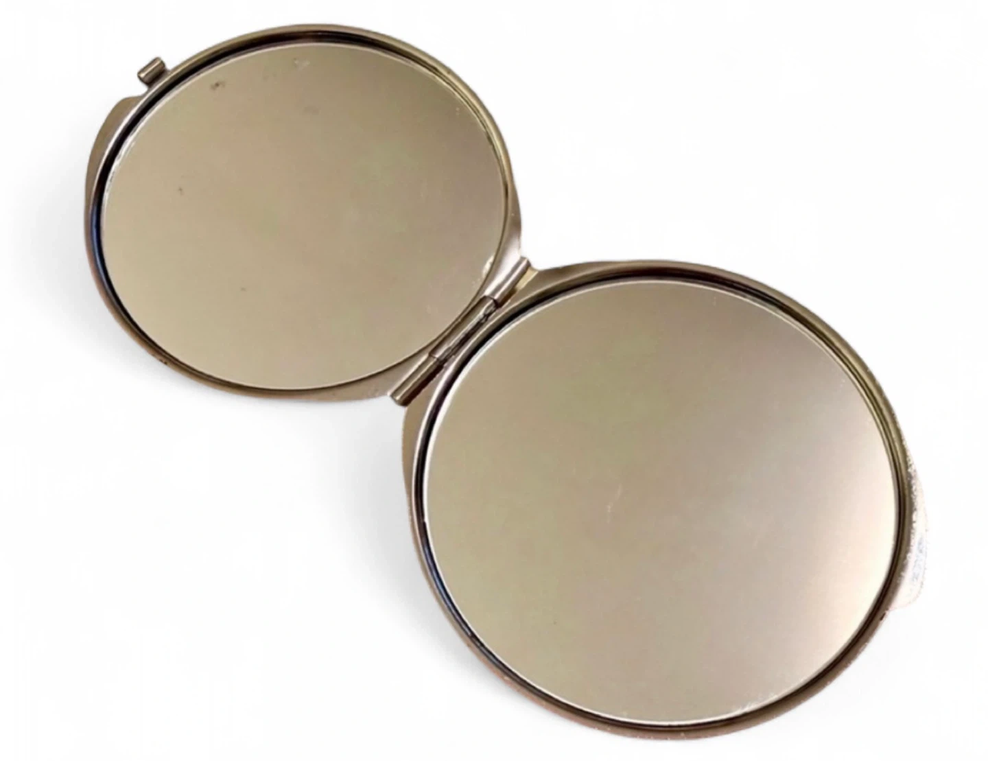 I’m the original owner, I forget where it was from but I know it’s rare. No jewels missing or major flaws, but view photos carefully. Keep in mind the age of it and I used it a lot growing up. Absolutely gorgeous in person and the mirrors are pretty good quality. Perfect for putting in your purse or travelling.