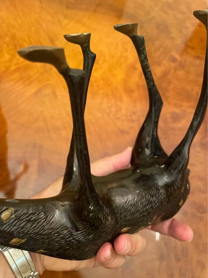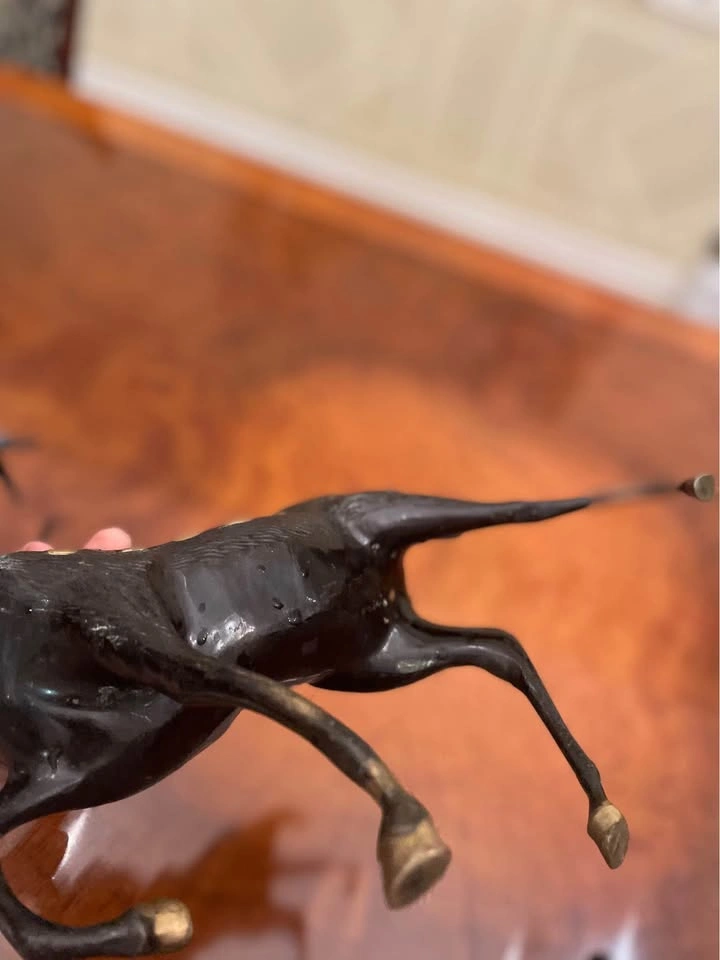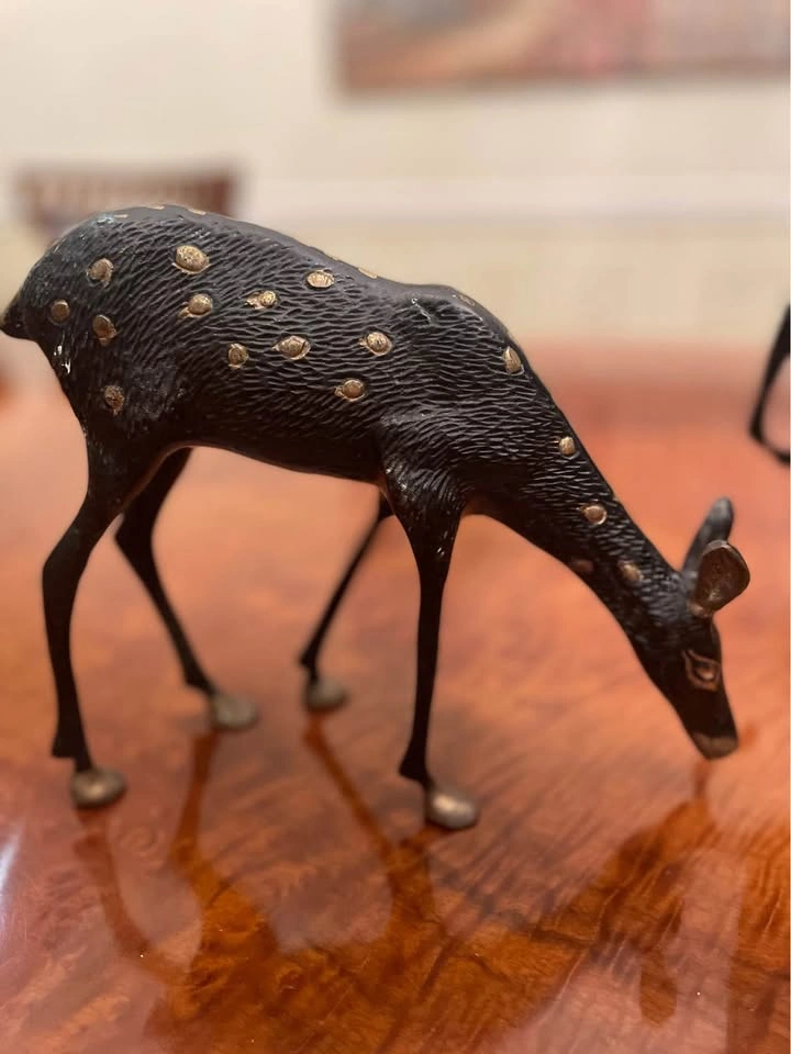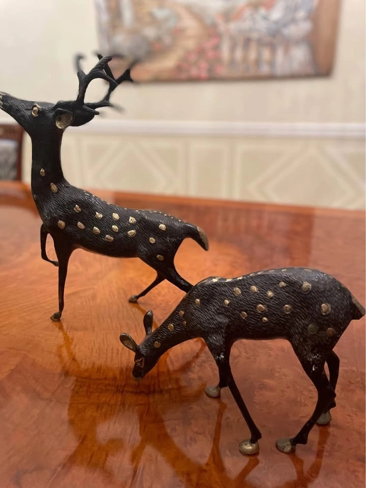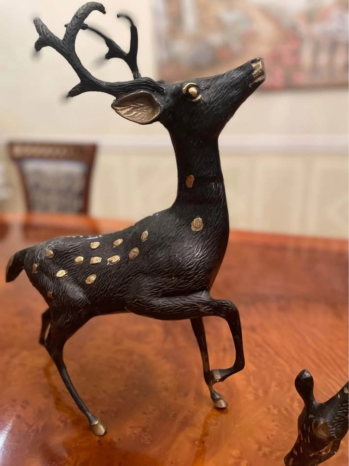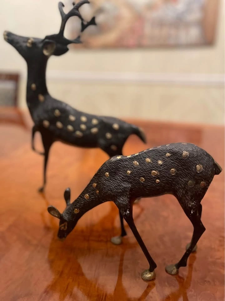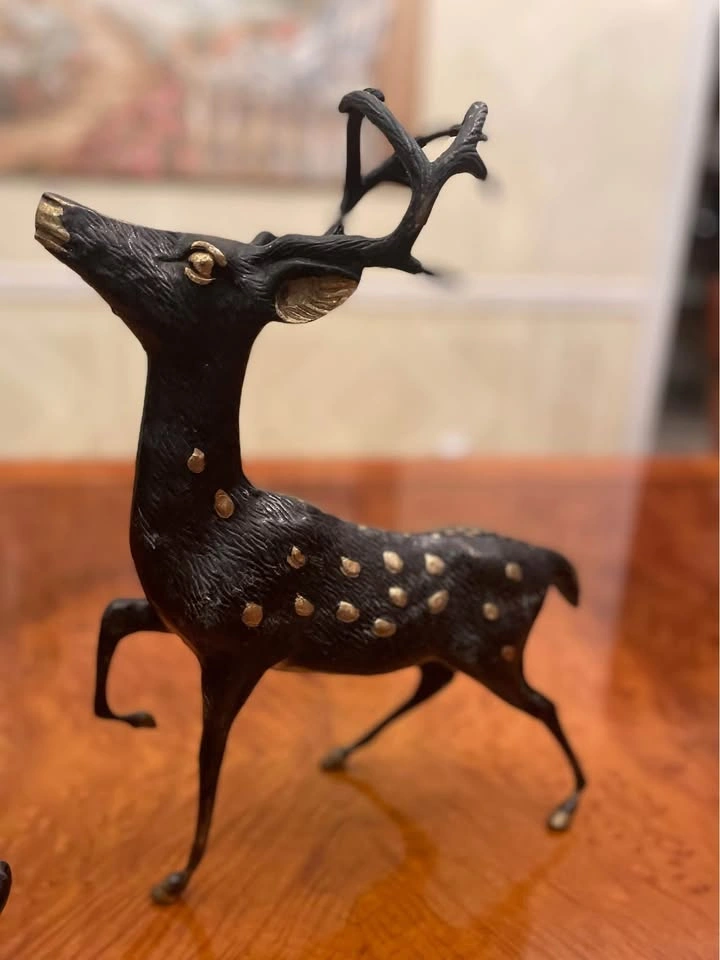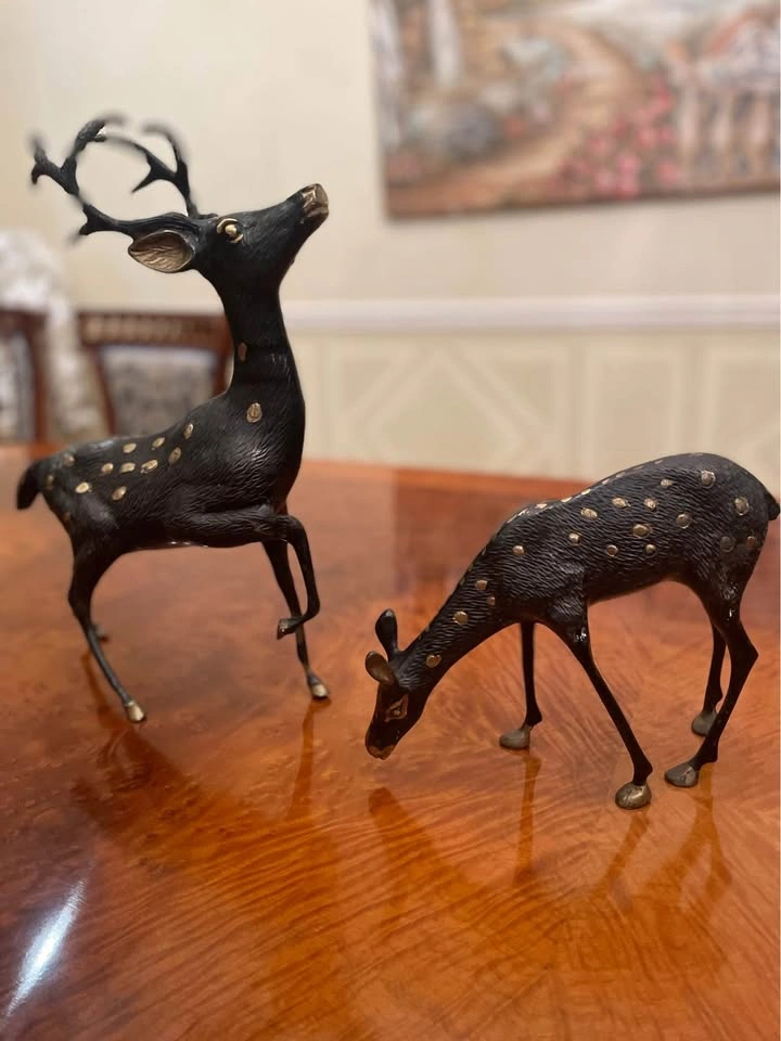 60Pair of decorative deers one with antlers standing up while the other gaze , made of brass with bronze patina, the one with antlers 12”L 15” tall 4”W, smaller one 9.5” L 8” tall 3.5”W, nice weight on it, price for the pair
