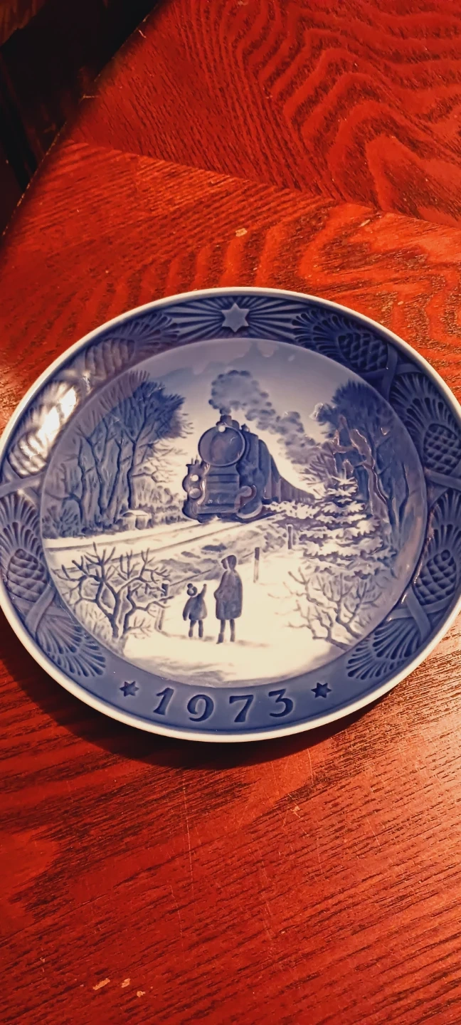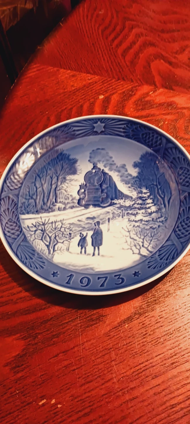 1000+Selling a beautiful Royal Copenhagen collector's plate from 1973! The plate features a lovely winter scene with a train and two figures. It's titled "Going Home for Christmas" and would make a wonderful addition to any collection !! Excellent Mint Condition. 7" diameter. MADE IN DENMARK. ALL MY PRICES ARE NEGOTIABLE !!