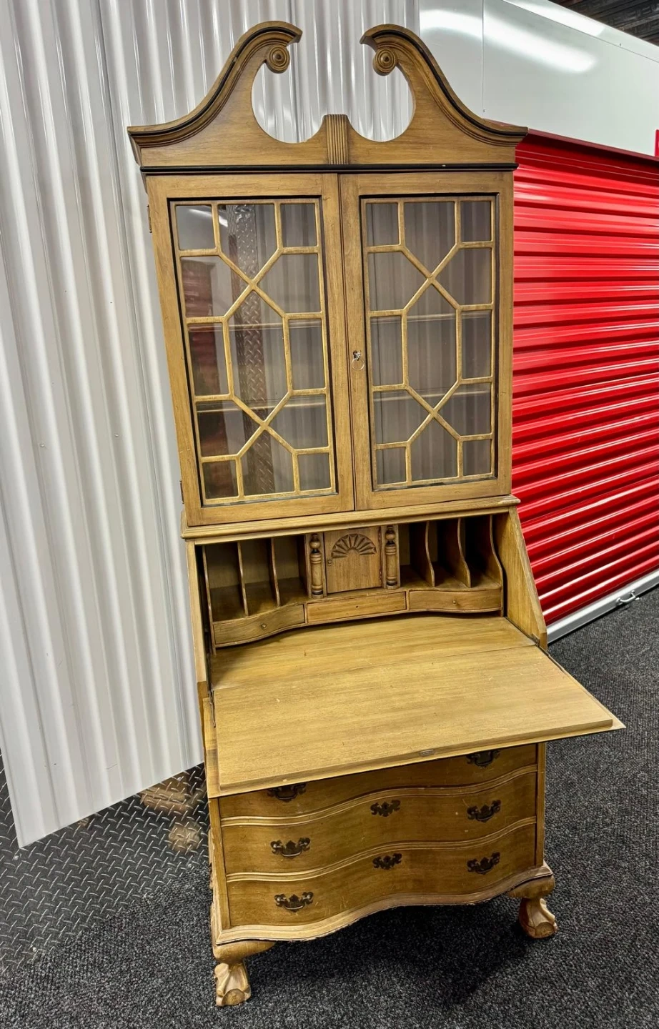 Selling a vintage secretary desk with a hutch. It's a beautiful piece of furniture that offers both storage and a workspace. The desk features a drop-down writing surface, drawers, and a hutch with glass doors. It's perfect for adding a touch of classic elegance to your home!