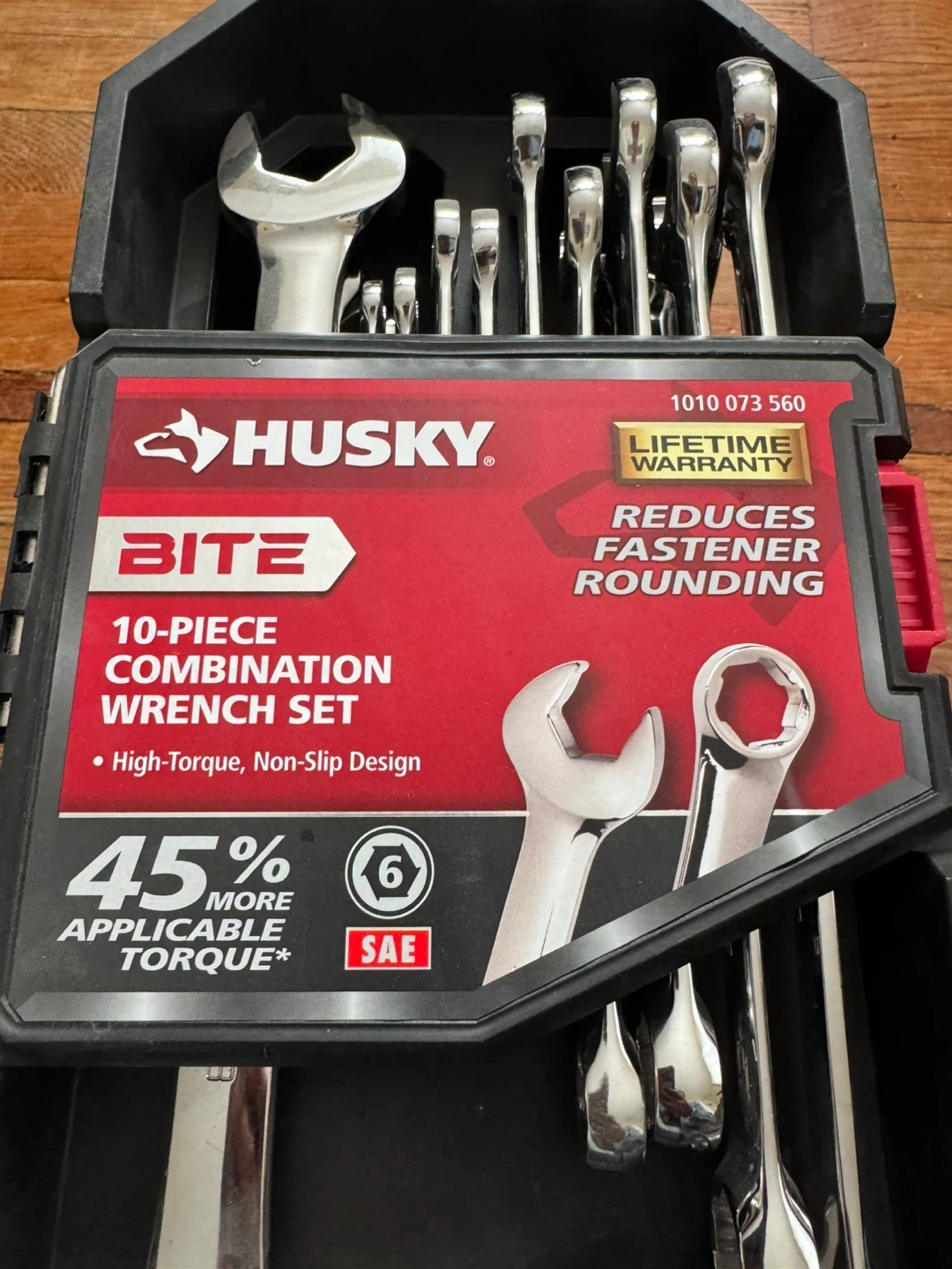 Selling a Husky 10-piece combination wrench set! The set comes with SAE wrenches including sizes 1/4, 5/16, 3/8, 7/16, 1/2, 9/16, 5/8, 11/16, 3/4, and 7/8 in. The wrenches are high-torque and feature a non-slip design. They also reduce fastener rounding. The package doubles as a storage rack for organization