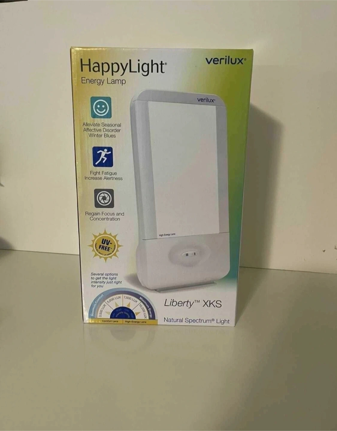 Verilux HappyLight Liberty XKS Energy Lamp! This energy lamp helps to alleviate seasonal affective disorder and winter blues, while also fighting fatigue and increasing alertness. It also helps regain focus and concentration. It's UV-Free and has several options to get the light intensity just right for you!