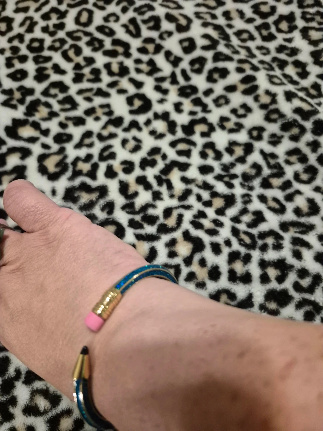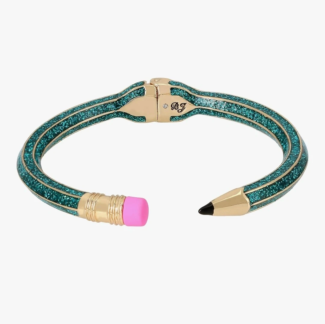 This is a Betsey Johnson pencil hinged bangle. It's a fun and unique accessory that looks great on any wrist. It features a pencil design with a pink eraser and a sparkling blue pencil body. A great gift for any artist or writer!