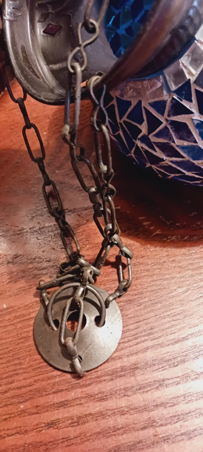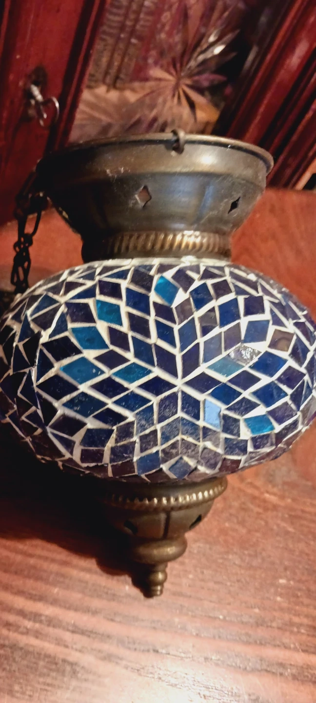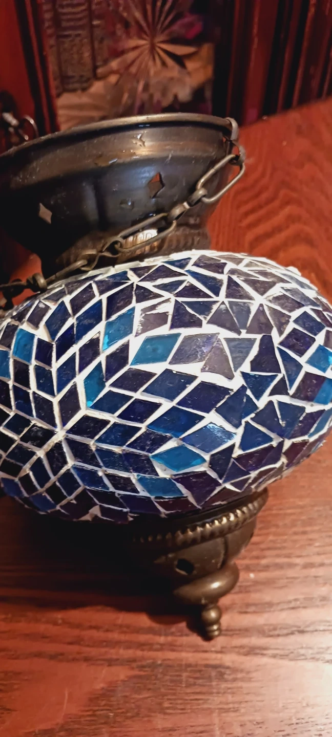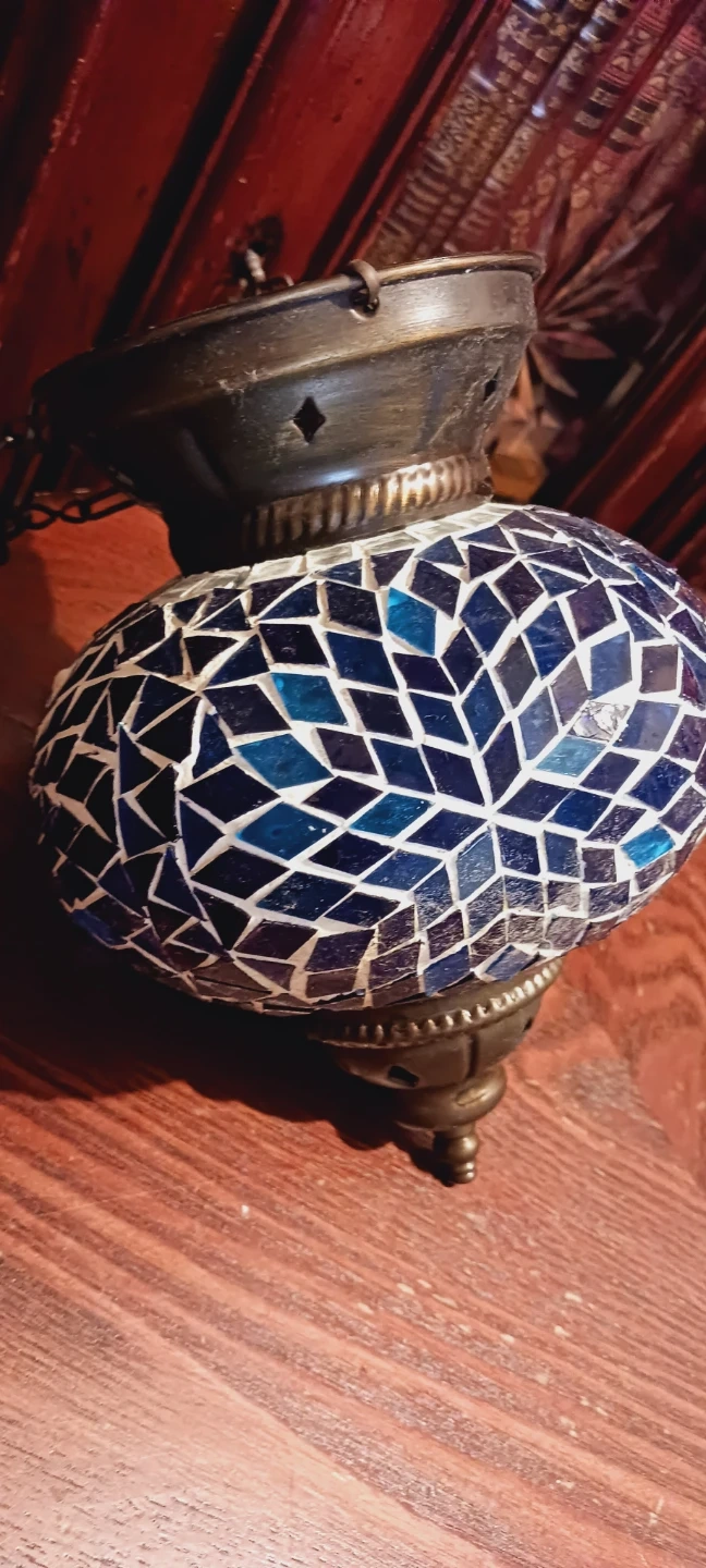1000+This is a beautiful Handcrafted Turkish Morrocan Mosaic hanging lamp shade. It has a unique design with blue and white mosaic tiles. Perfect for adding a touch of elegance to any room!! 11"×6". Excellent condition. Made in Turkey. ALL MY PRICES ARE NEGOTIABLE !!