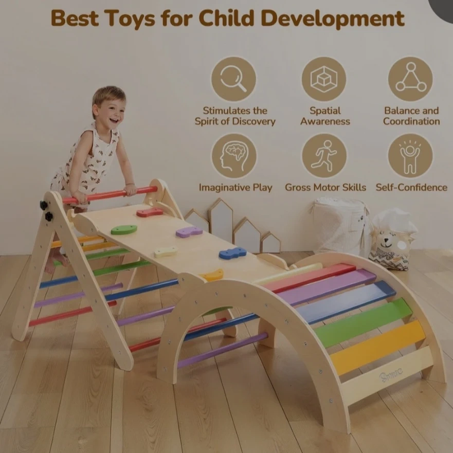 This is a Smric 8-in-1 Pikler Climber Set, perfect for babies and kids aged 0.5 to 6 years old! This set stimulates the spirit of discovery and helps with spatial awareness, balance, and coordination. It also encourages imaginative play, gross motor skills, and self-confidence. The box is included!