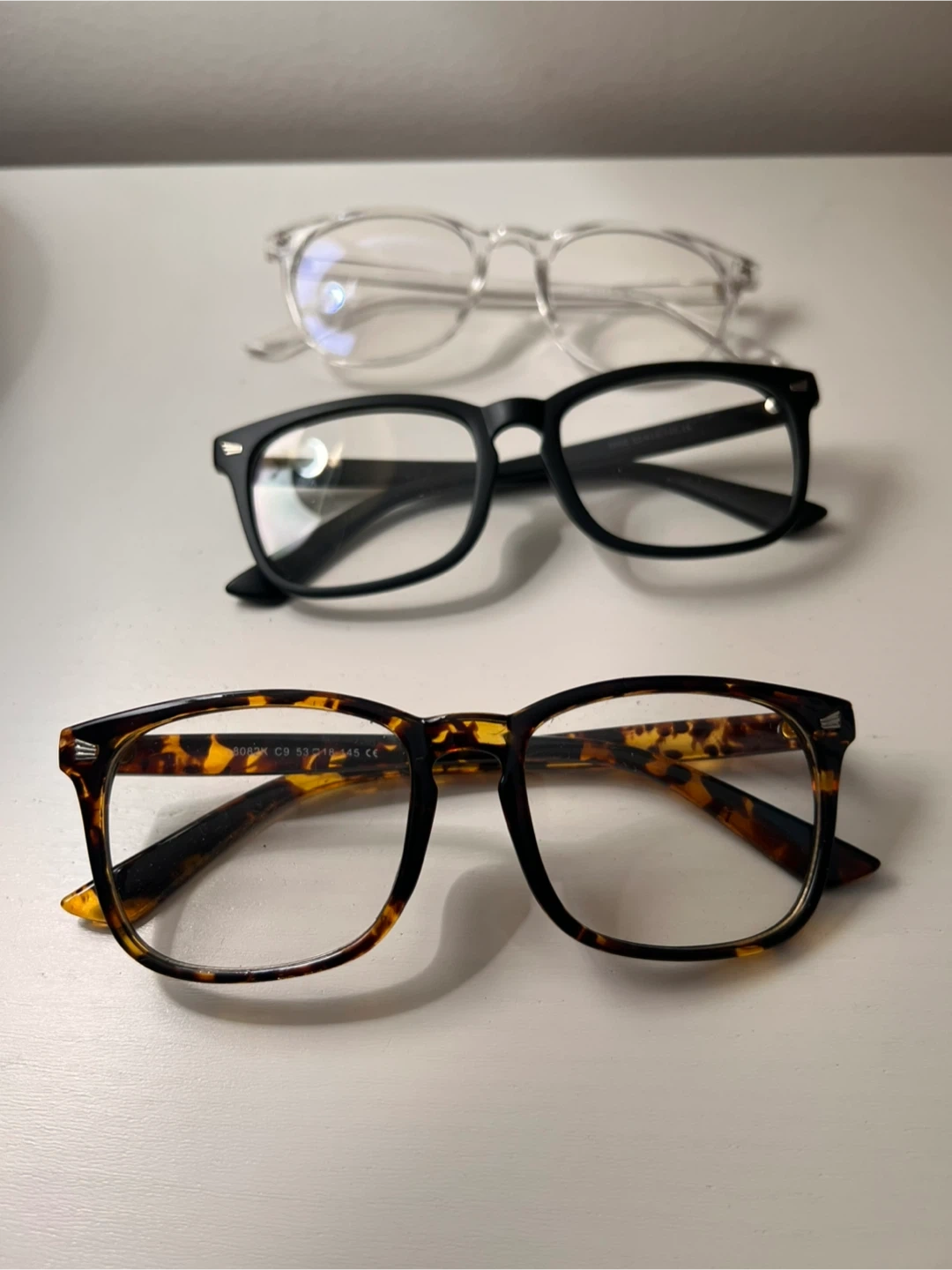 Selling three pairs of eyeglasses. One pair is black, one is clear, and the other is tortoise-shell patterned. They are in good condition!