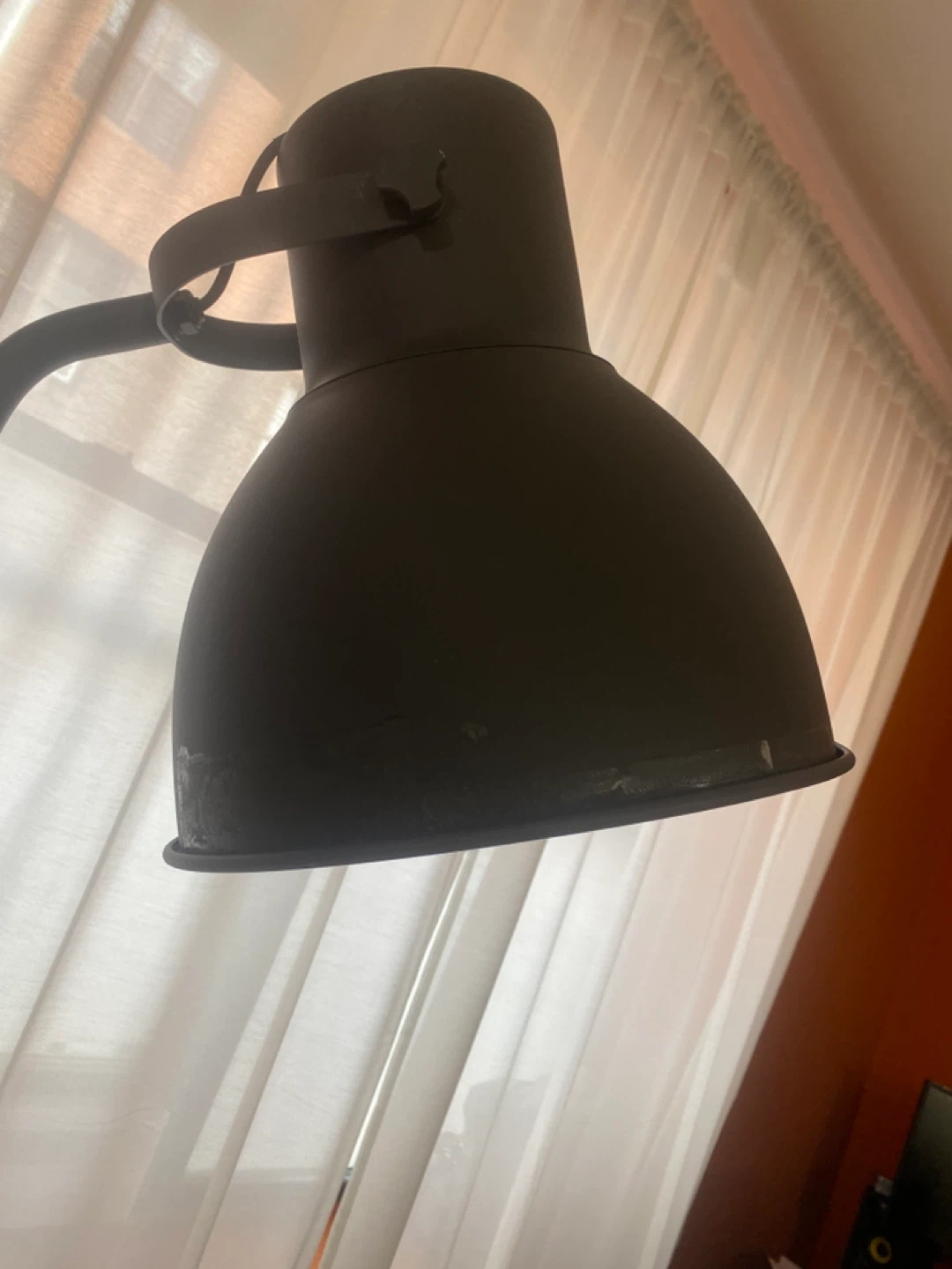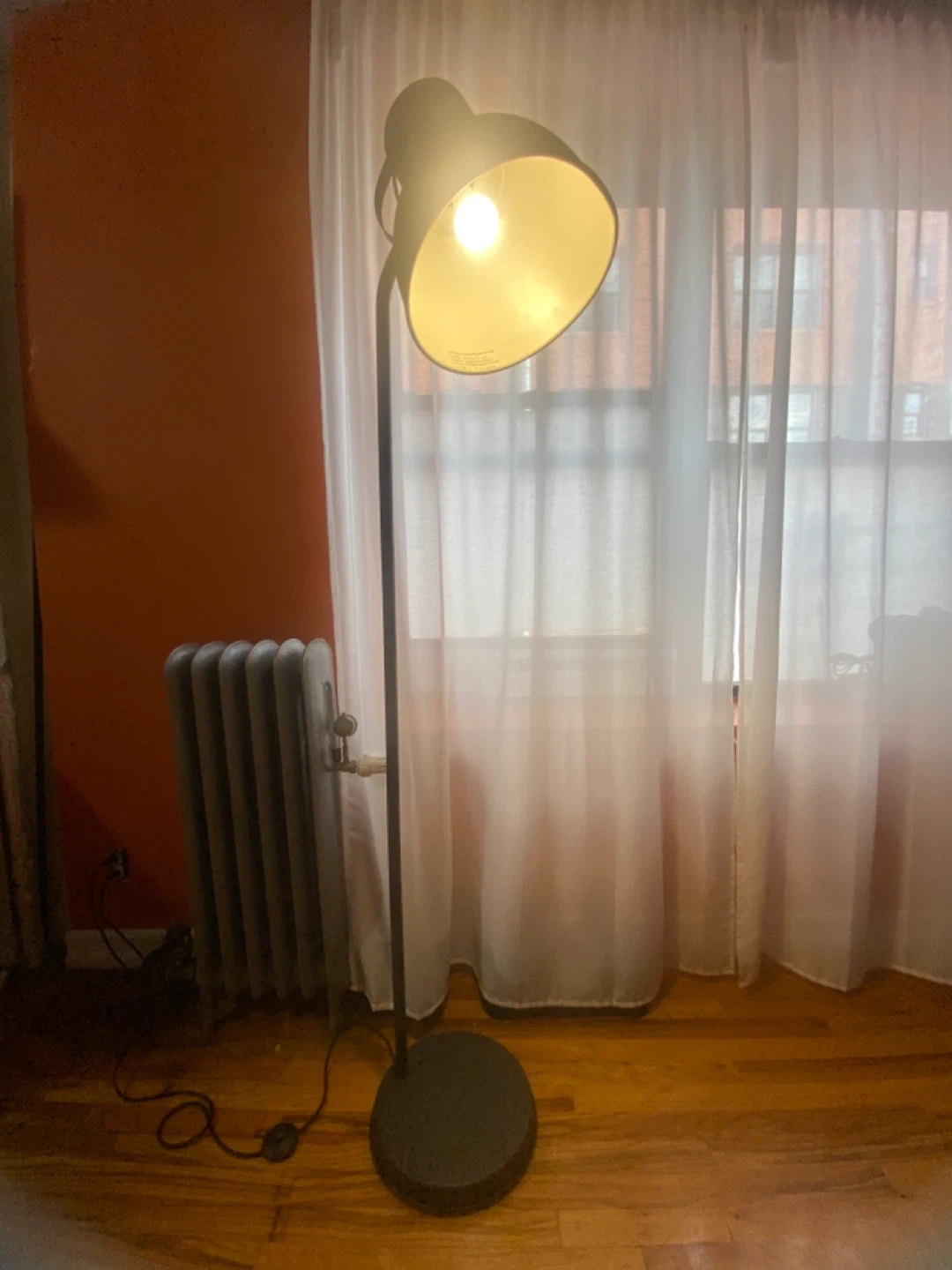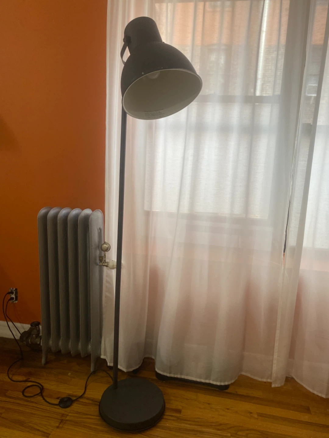 Selling an IKEA floor lamp in matte black. It works perfectly and the lamp head is adjustable, so you can tilt/angle it to point the light where you need it — great next to a sofa or for reading.
