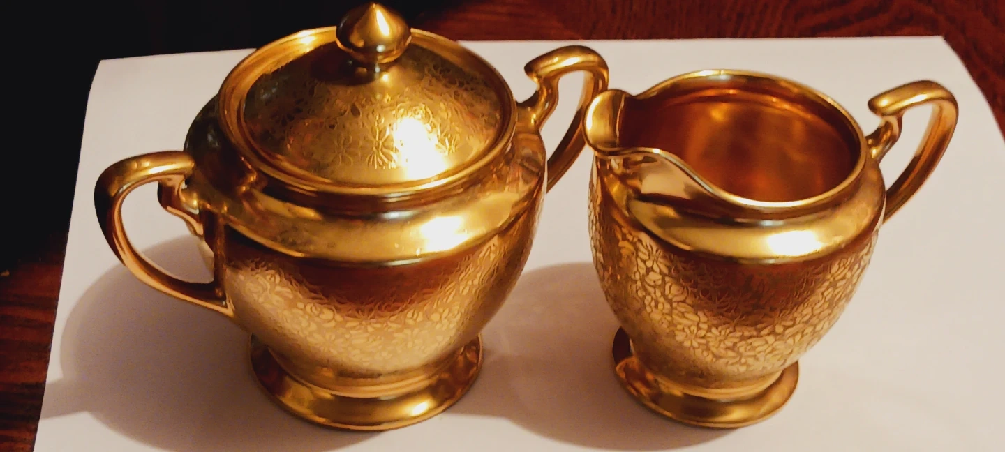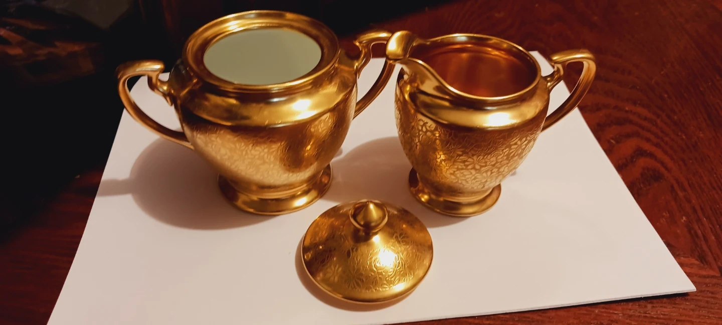 1000+Pickard 22K GOLD Encrusted Cteamer and Sugar Bowl Set. The set is decorated in the U.S.A. and features a lovely floral pattern. Made in USA. EXCELLENT MINT CONDITION. 5"×4". ALL MY PRICES ARE NEGOTIABLE !!