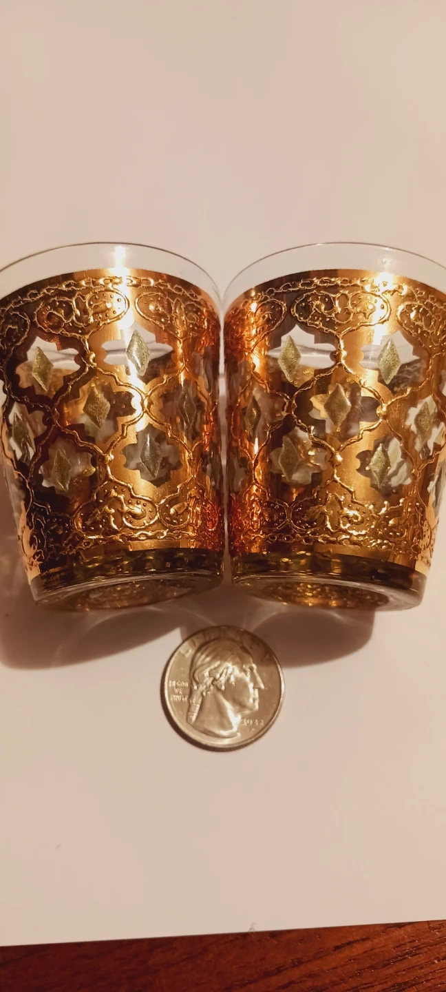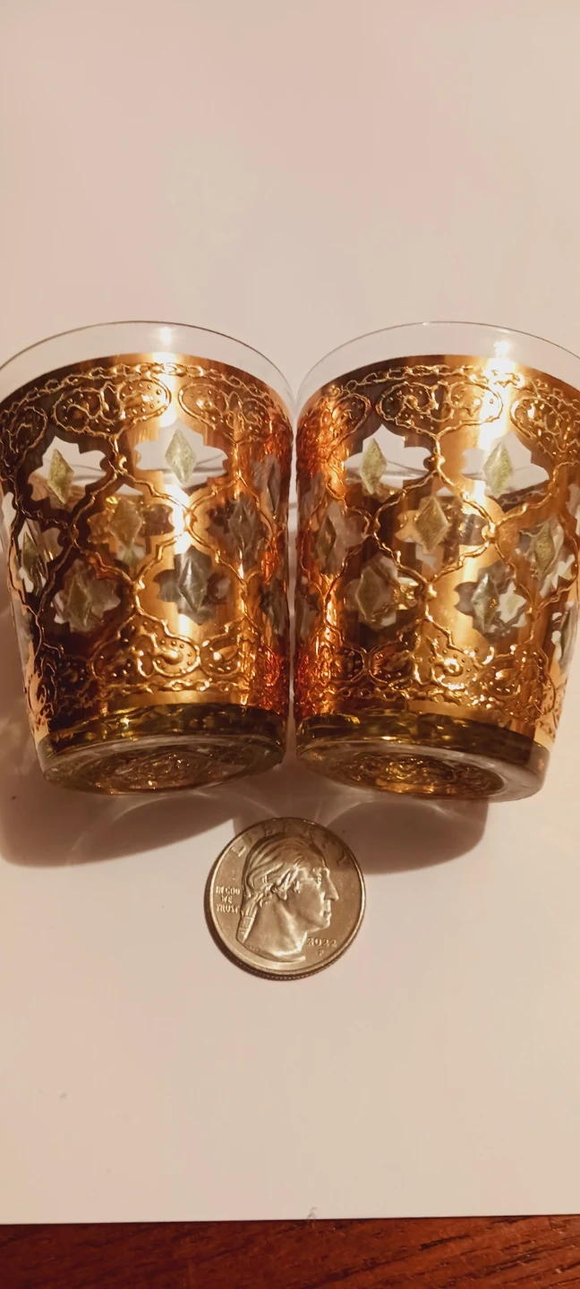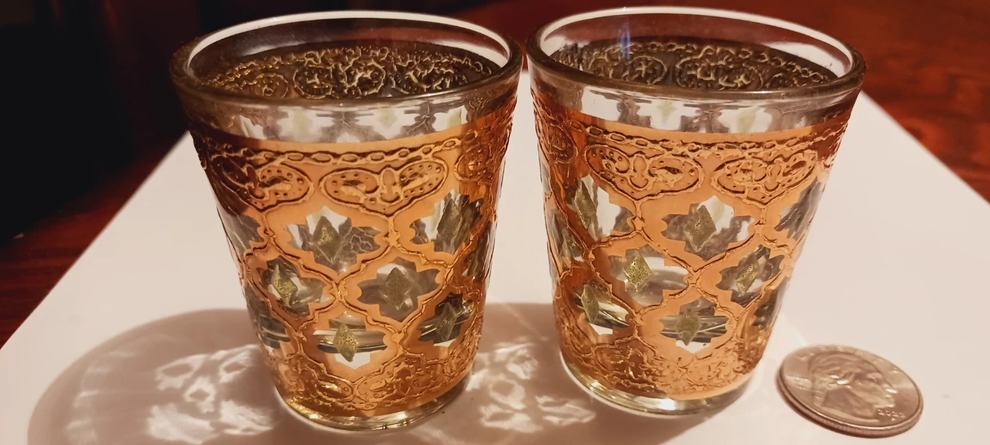 1000+22K GOLD ENCRUSTED SET OF 2 GORGEOUS MINI SHOT GLASSES !! Selling a set of two decorative glasses with a beautiful 22K gold pattern. These glasses are perfect for adding a touch of elegance to your home decor! They are in great condition and ready for new home. 2.5"×2". Excellent condition. ALL MY PRICES ARE NEGOTIABLE !!!