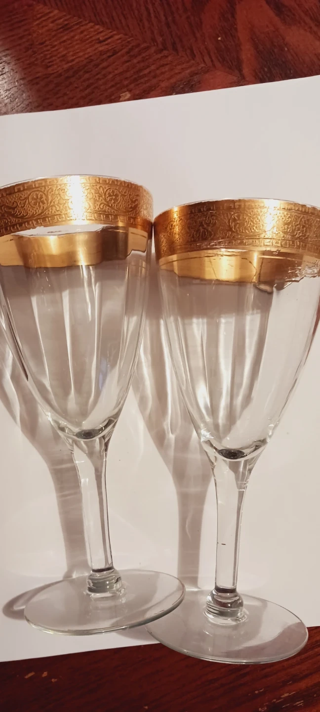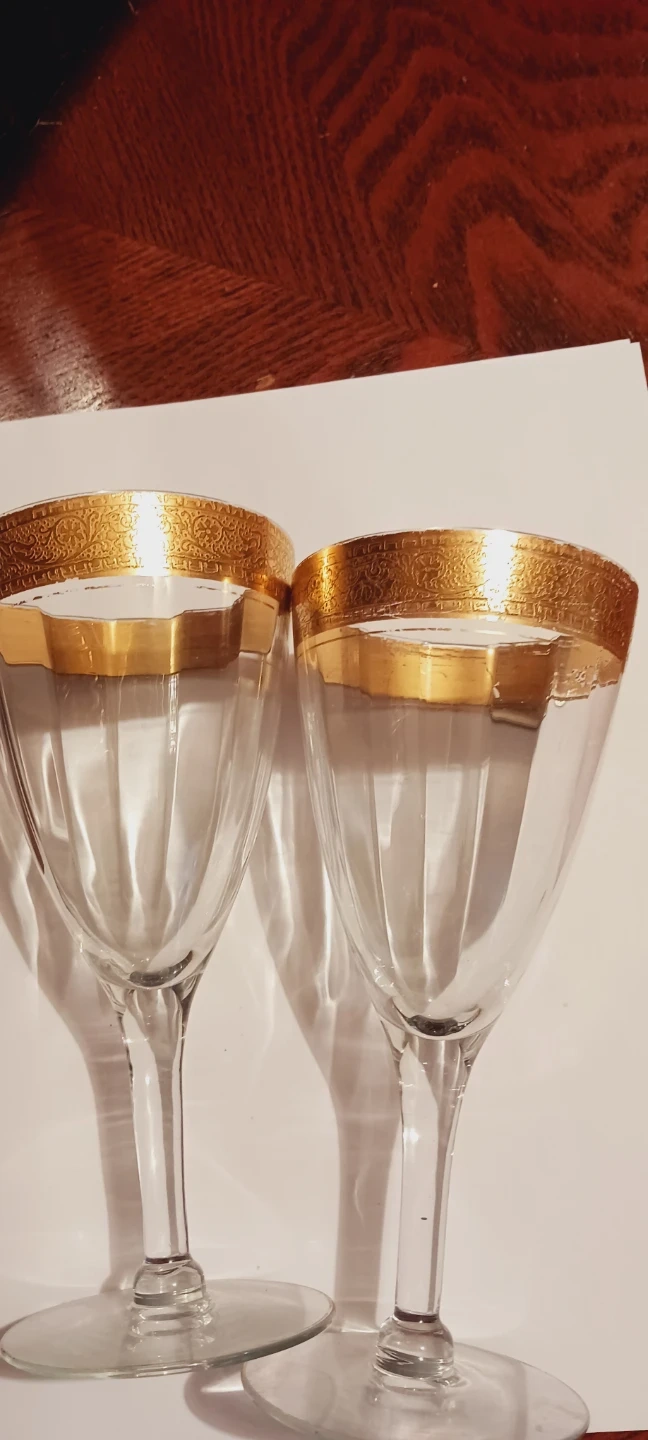 1000+Selling a set of two elegant 1940s vintage 22K Gold Rim wine glasses. They feature a beautiful 22K gold rim design that adds a touch of sophistication to any table setting. Perfect for wine enthusiasts or anyone looking to elevate their glassware collection!!!! 7"×3". Good condition. ALL MY PRICES ARE NEGOTIABLE !!