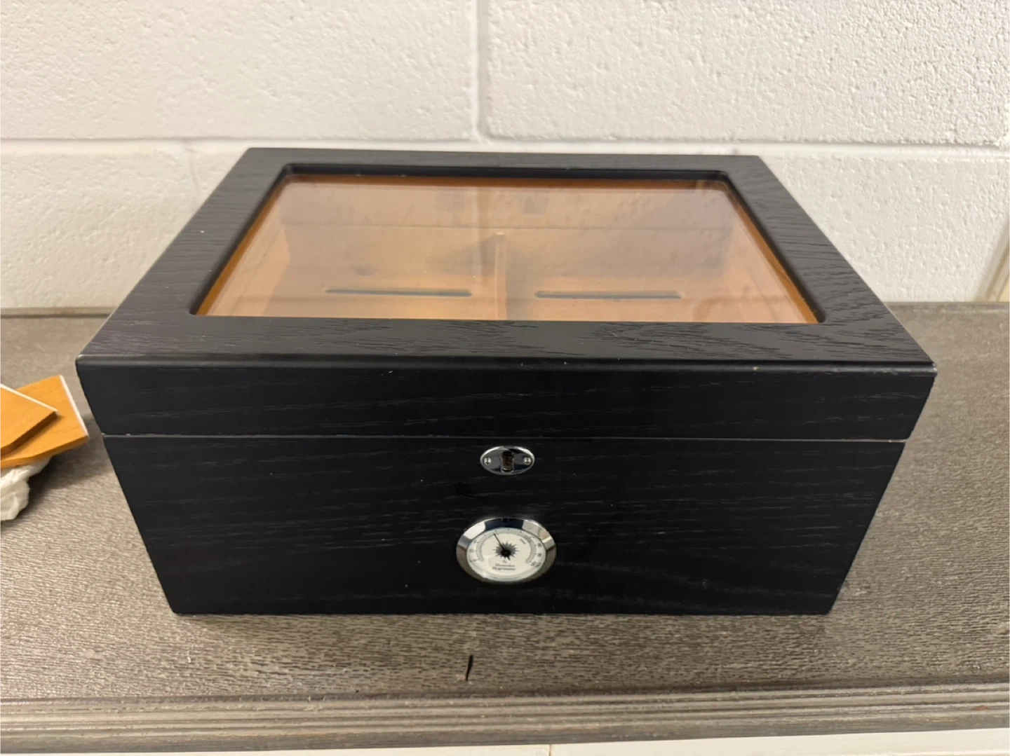 12Selling a wooden humidor box in good condition. It features a black frame, a glass top, and wooden interior dividers. Perfect for storing cigars or other items that need humidity control