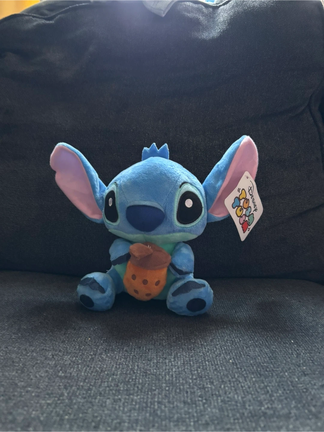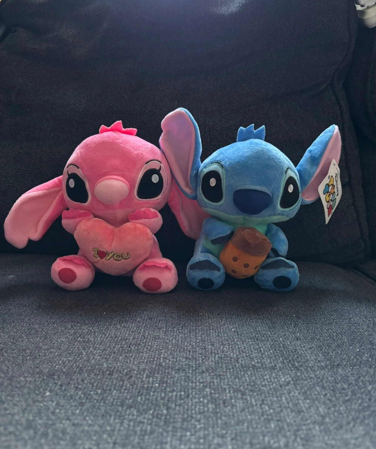 Selling a pair of adorable Disney Tsum Tsum Stitch plushies! One is pink with a heart, and the other is blue holding a little acorn. They're both in great condition and ready for a new home