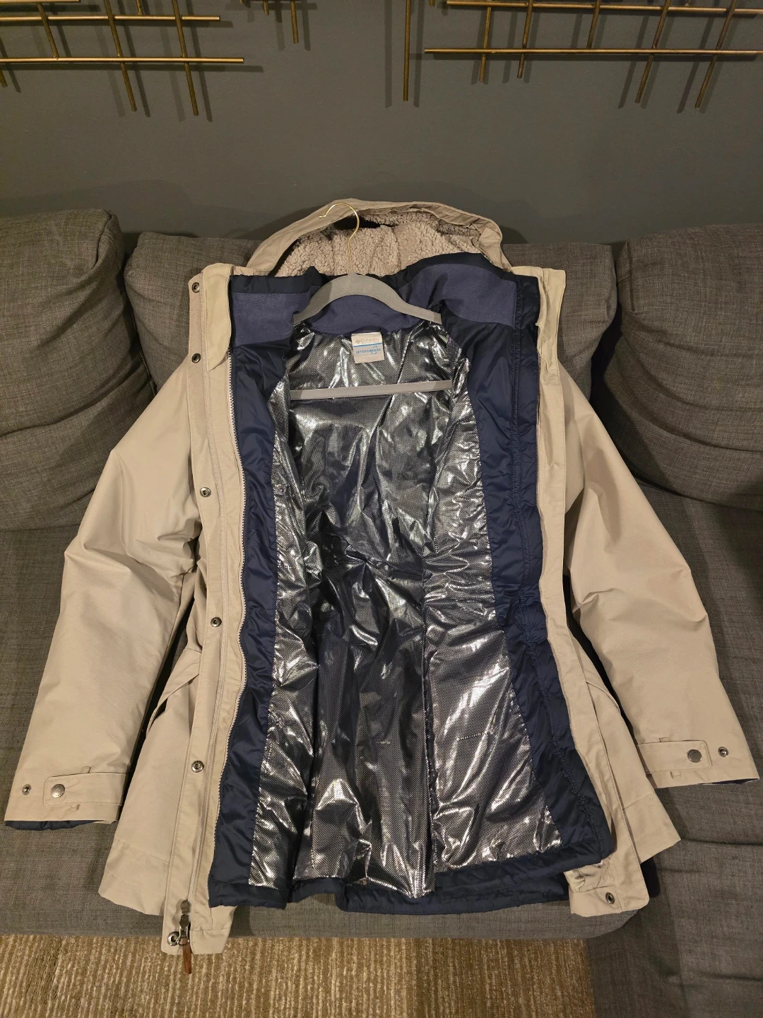 Columbia Jacket Womens Small Cream Interchange Omni Heat Puff Liner 3 In 1 in a beige color. It features a hood and a warm lining, perfect for cold weather. The jacket is in good condition and ready for a new owner!