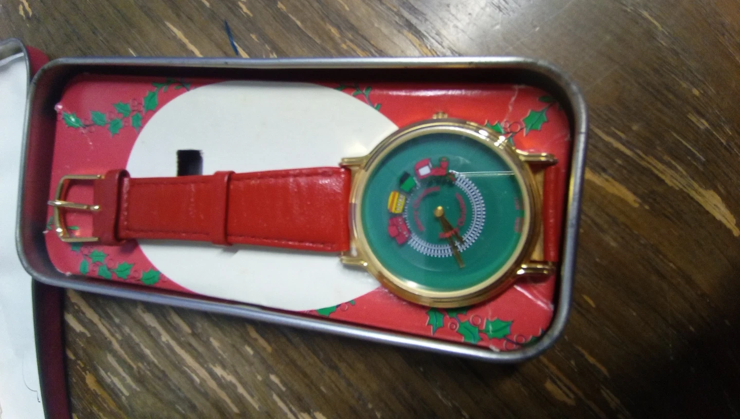 1000+Selling a vintage Christmas-themed watch! It comes in its original decorative tin. The watch has a red leather strap and a green face with Christmas imagery. It's a fun and festive accessory for the holidays!