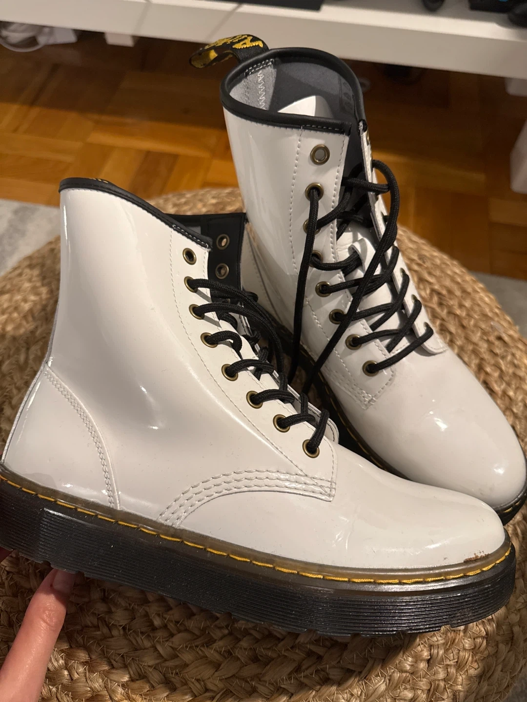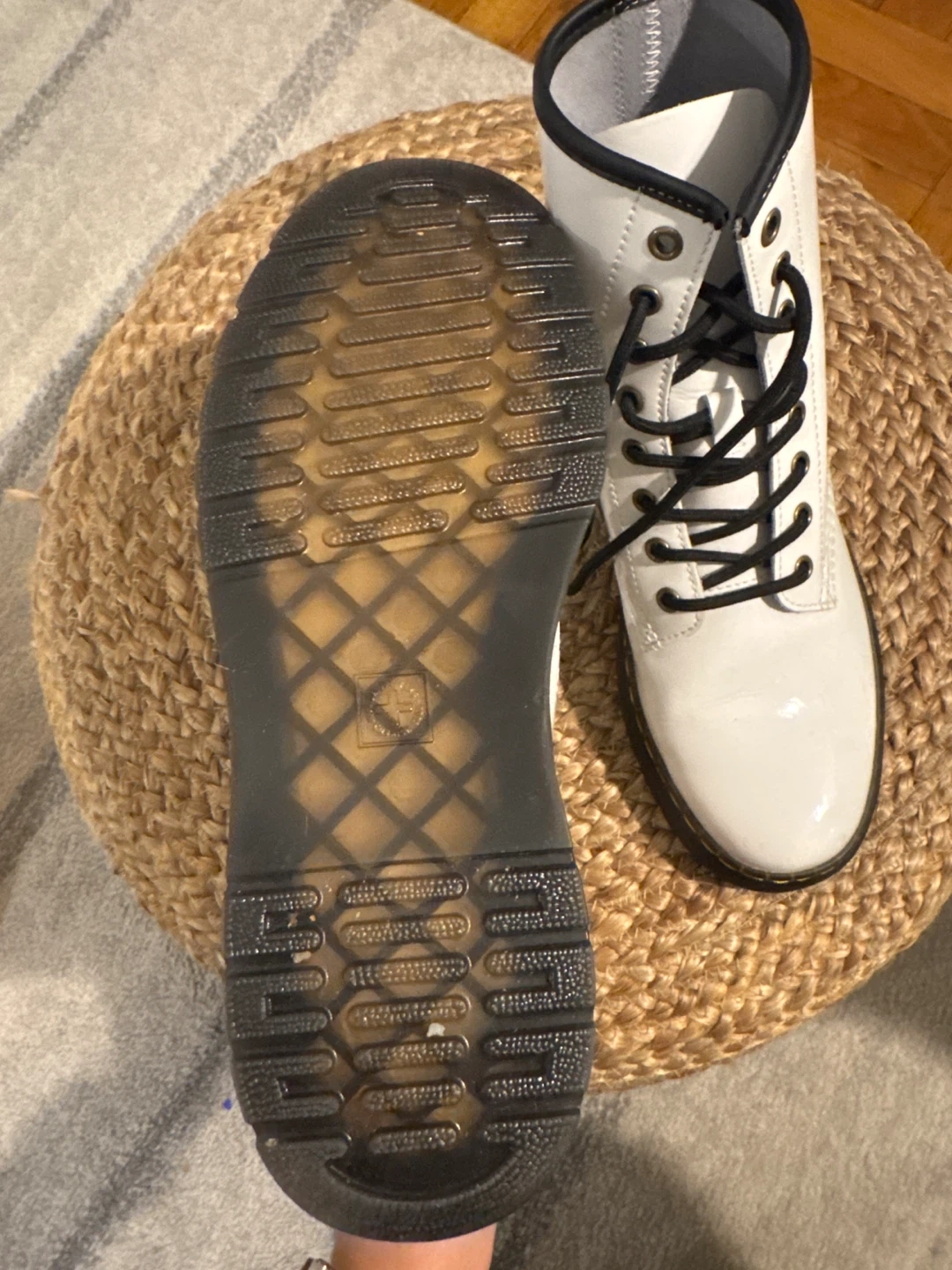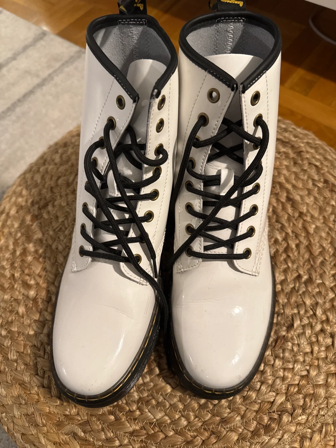 10Worn only once! the soles are almost brand new, as you can see! Classic Dr. Martens style in glossy white patent leather with black details and signature yellow stitching. Super comfortable once broken in, and perfect to elevate any outfit. Size: 7 UK 41 EU 8 US M 9 US L