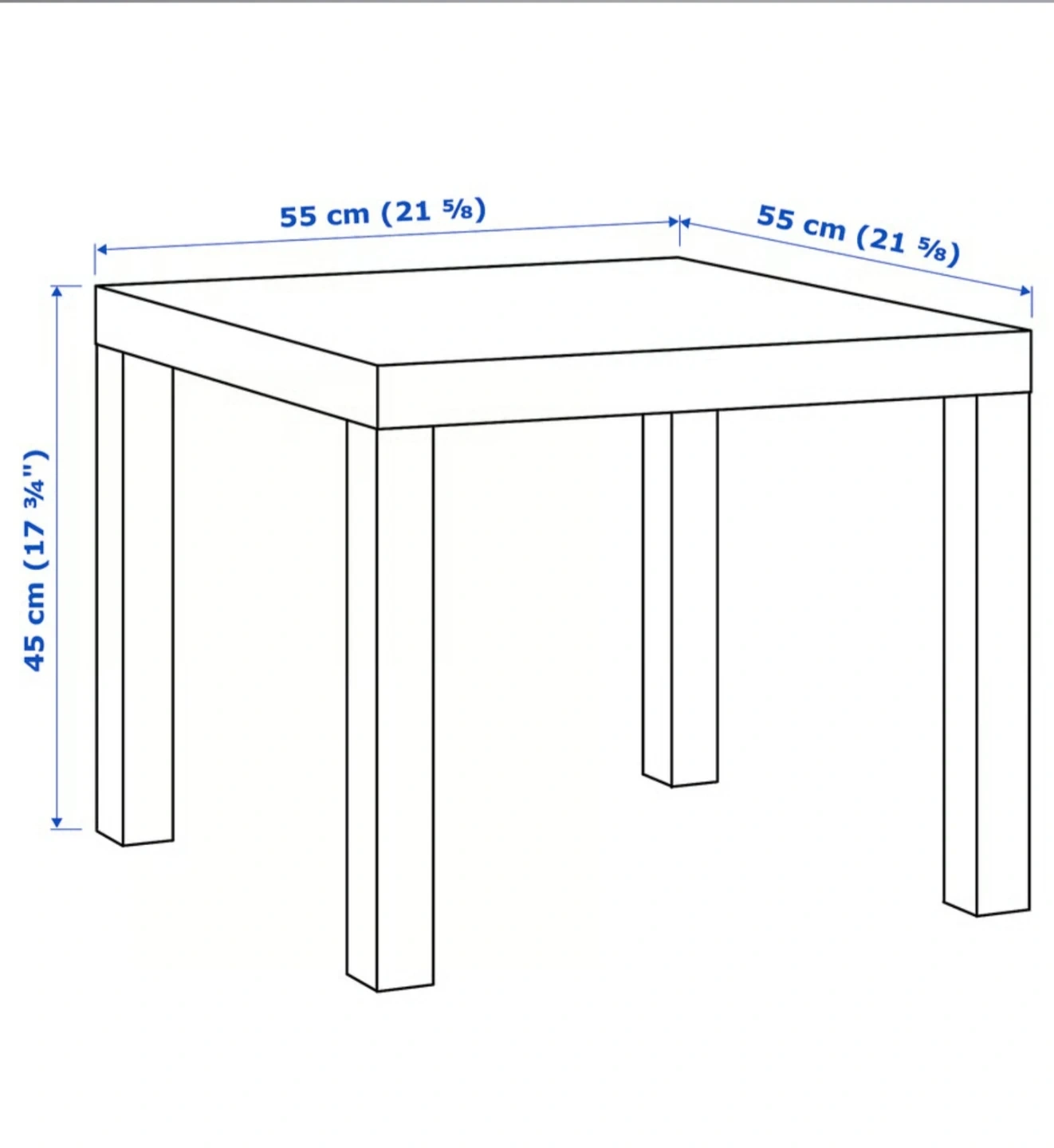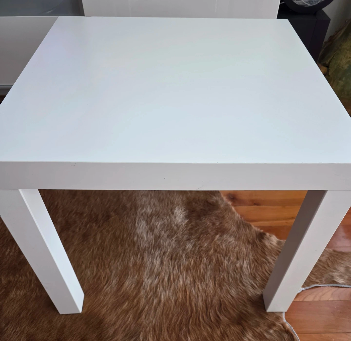 Selling a white IKEA Lack side table. It's in good condition and ready for a new home. The dimensions are 55 cm x 55 cm (21 5/8 inches)