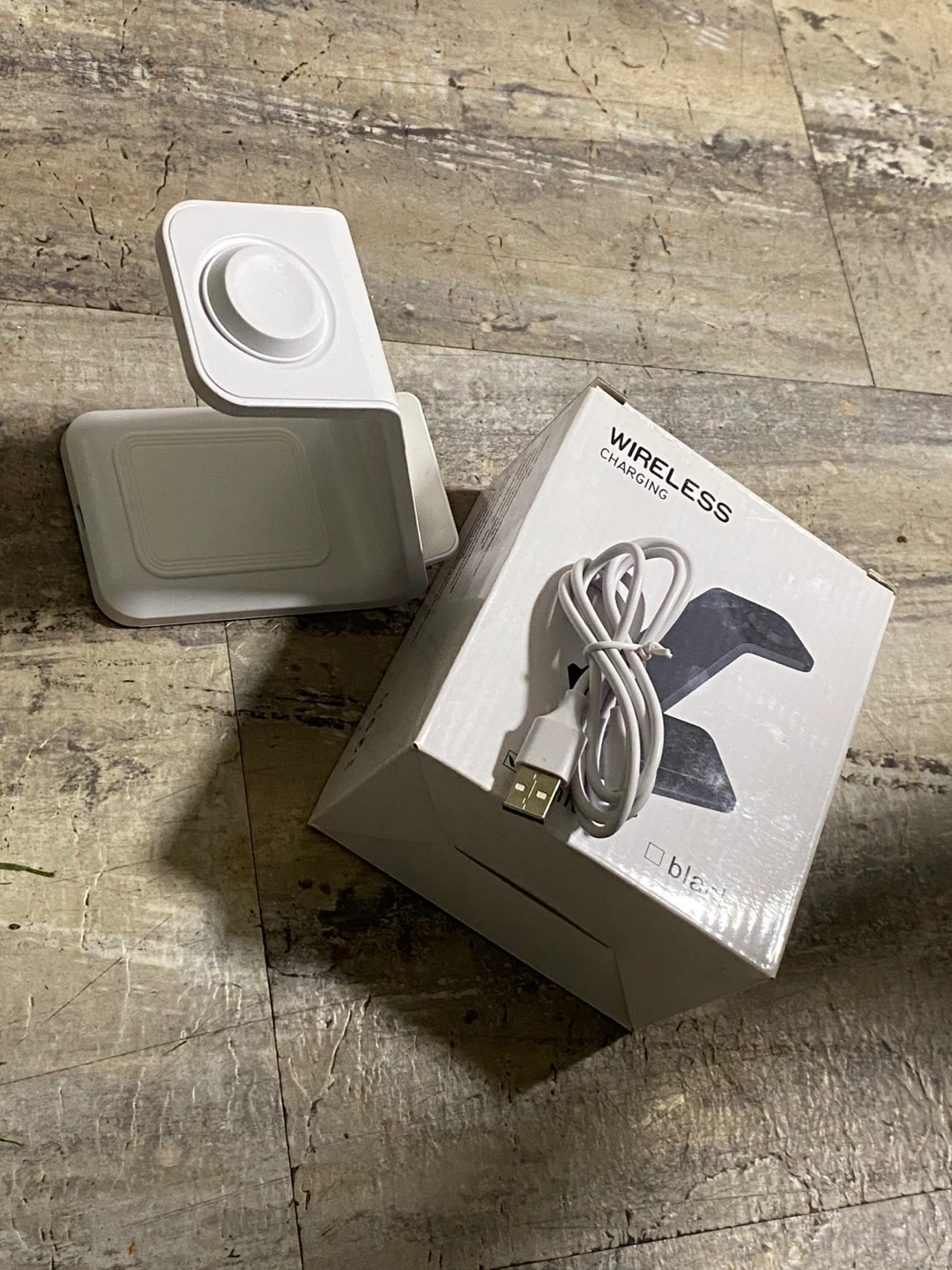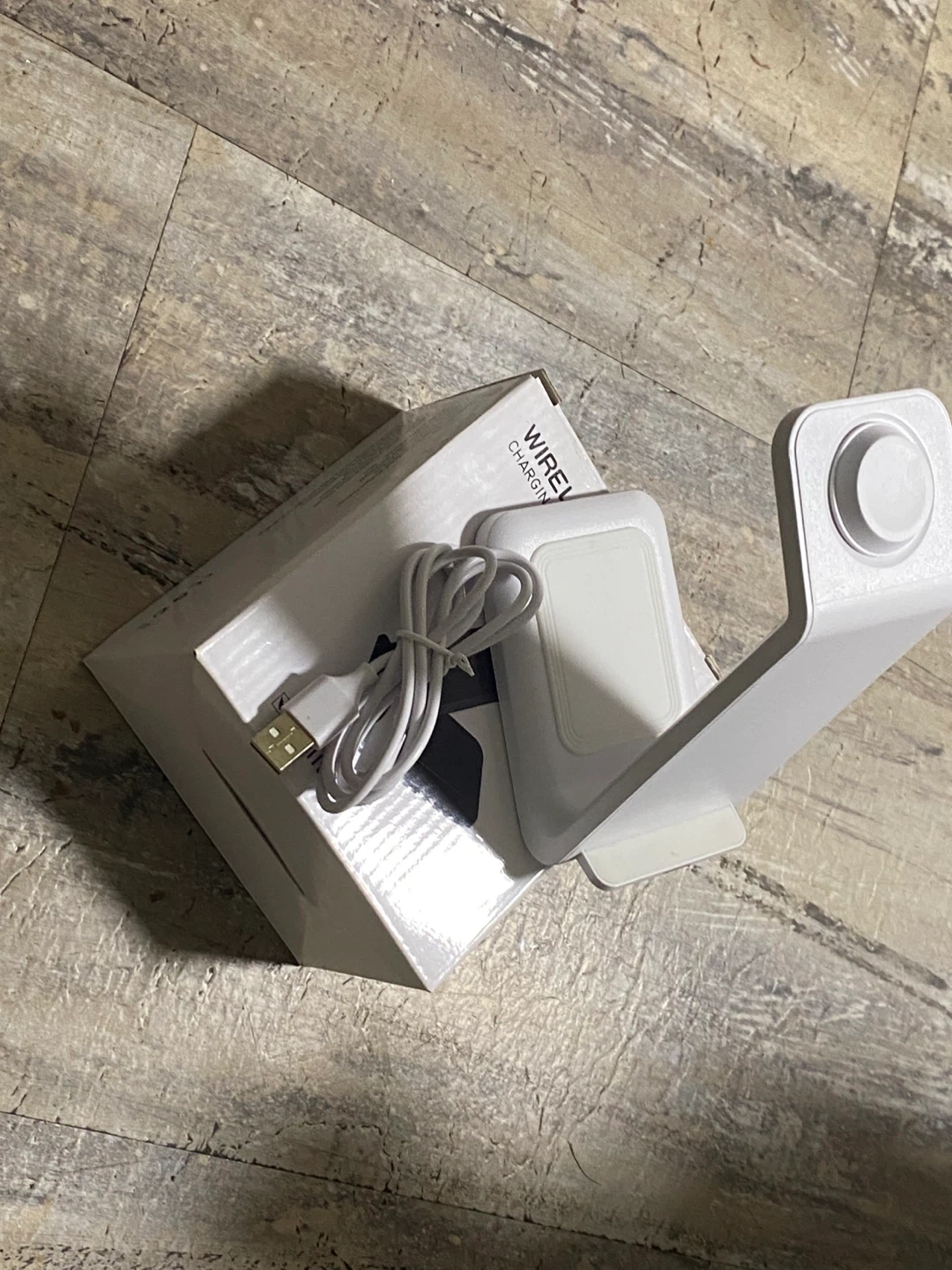 Selling a wireless charging station in white. It comes with its original box and charger. Perfect for keeping your devices charged and organized! And pick up only