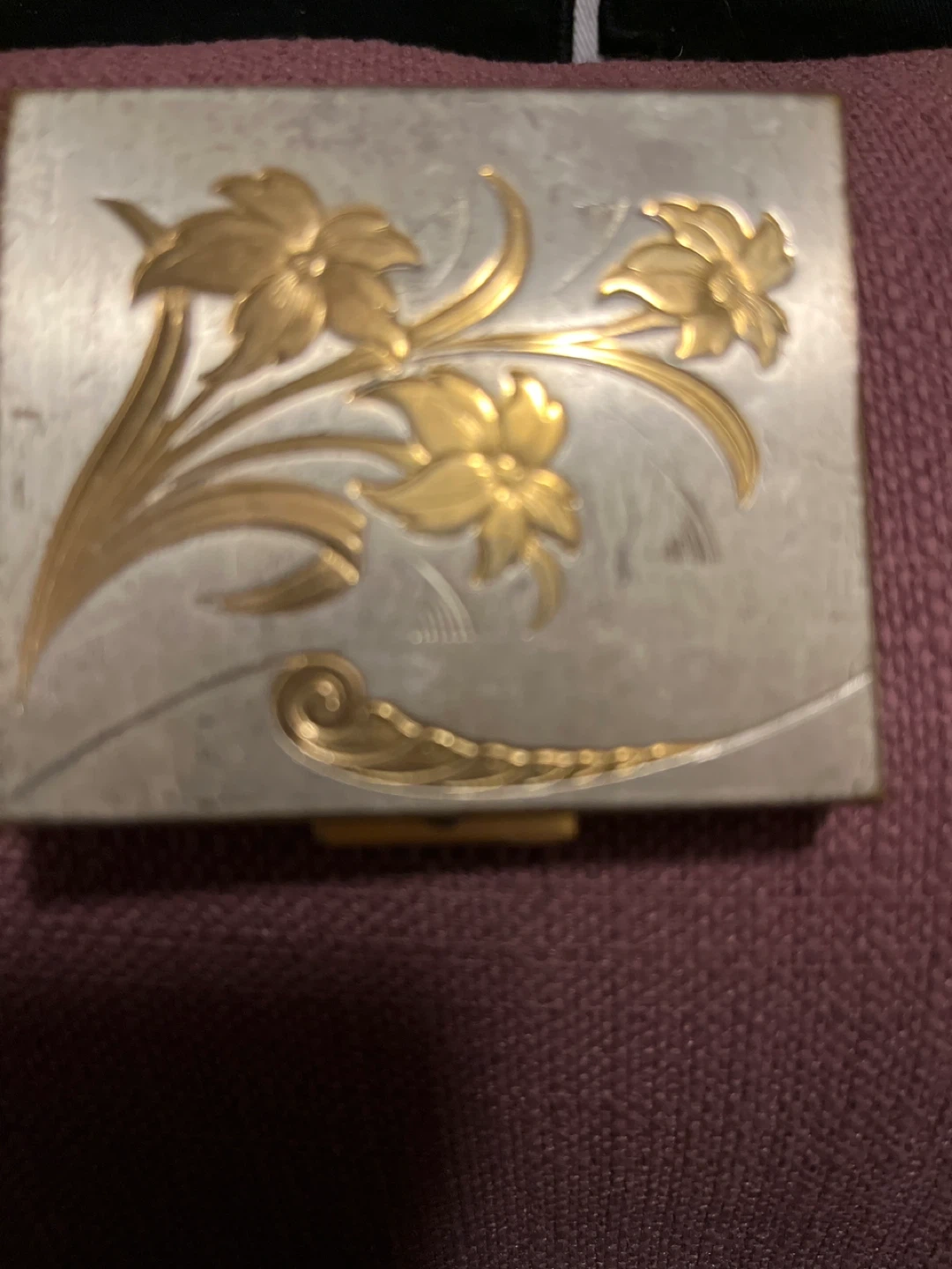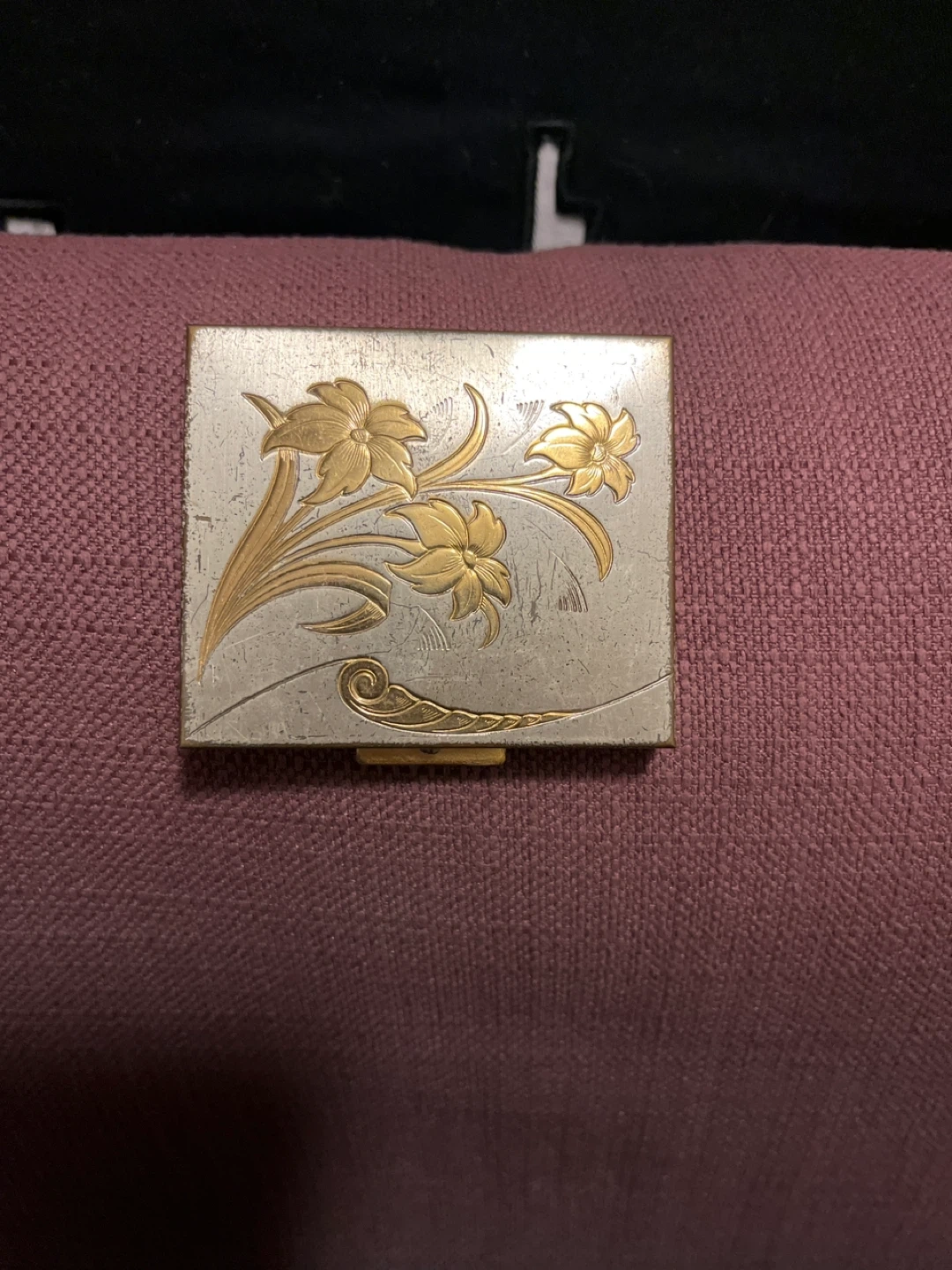 Selling a vintage compact with a silver and gold tone design! It features a floral pattern on the top and an intricate design on the bottom. Inside, there's a mirror and a patterned gold tone base. A lovely piece!