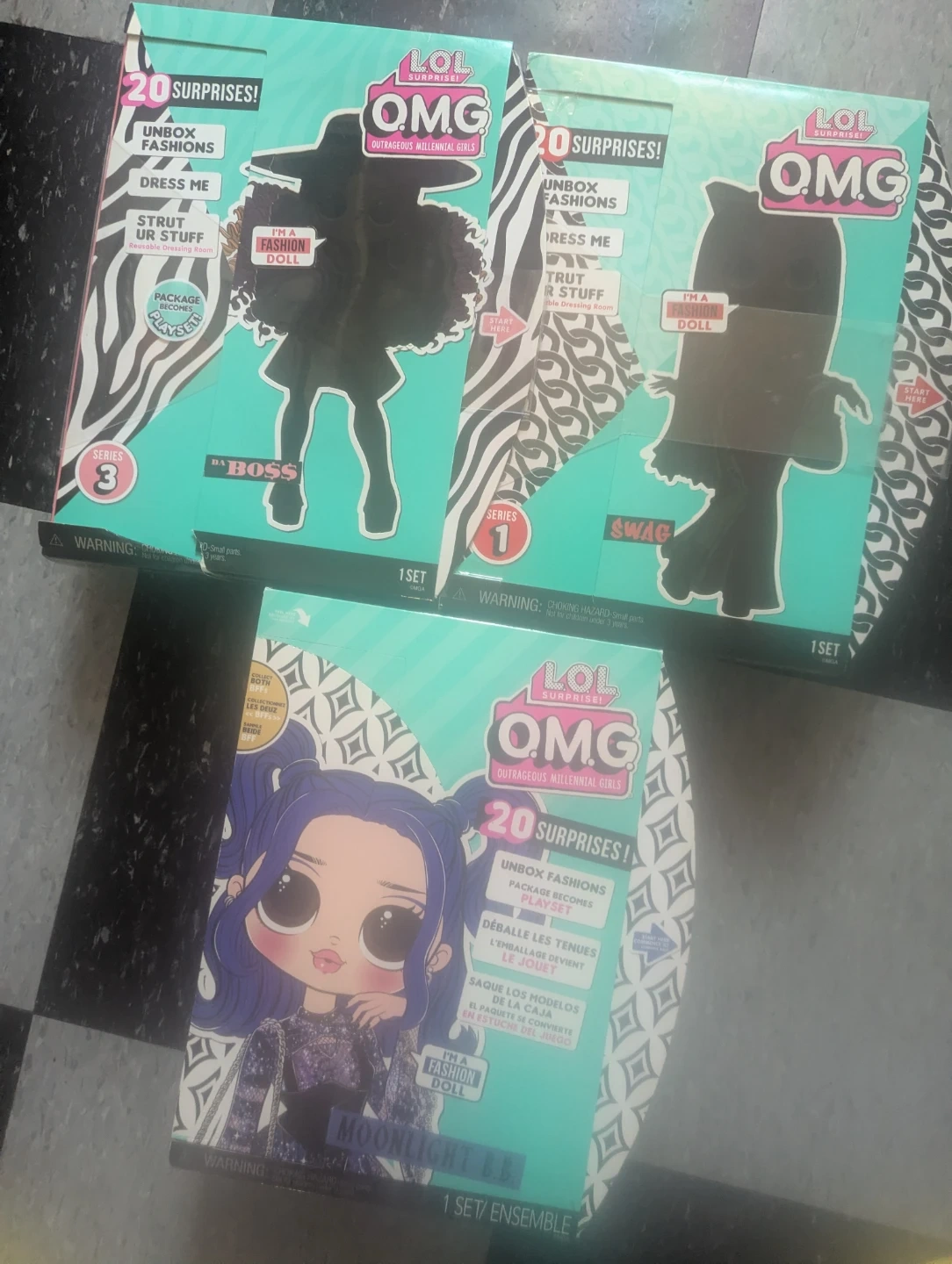 Selling a set of three L.O.L. Surprise! OMG dolls. Each box contains 20 surprises to unbox, including fashions and accessories. The dolls included are Moonlight B.B., Da Boss (Series 3), and Swag (Series 1). Great for collectors or kids who love fashion dolls!