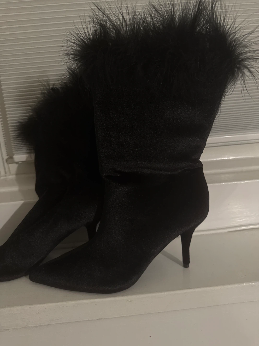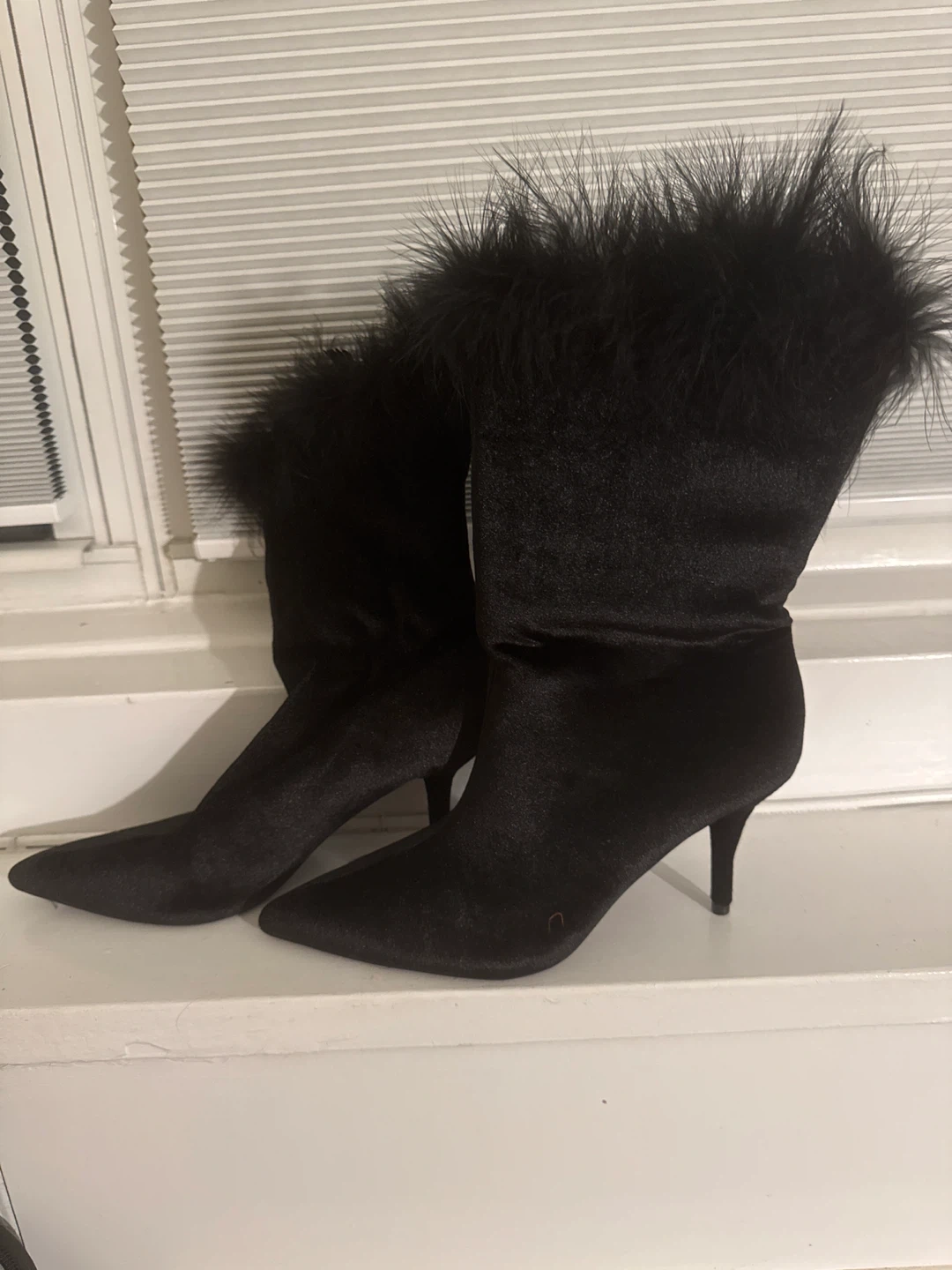 10BRAND NEW!! Selling a pair of black velvet boots with feather trim. They are super cute and in great condition. Perfect for a night out or adding a touch of glam to your everyday look! Size 9 Pick up in Columbus Circle or delivery