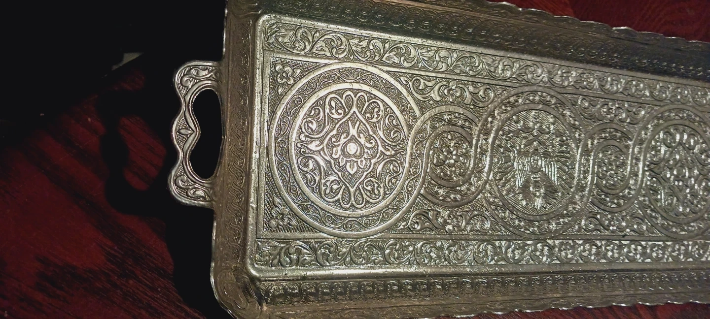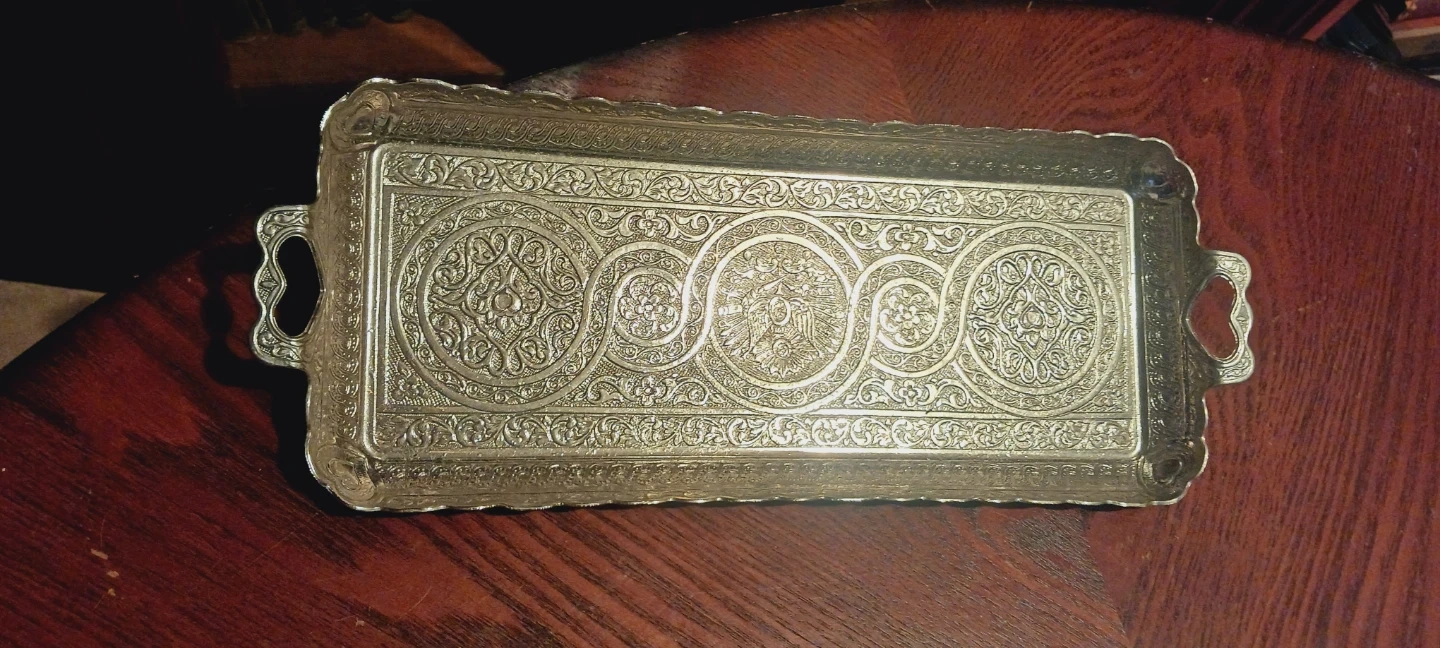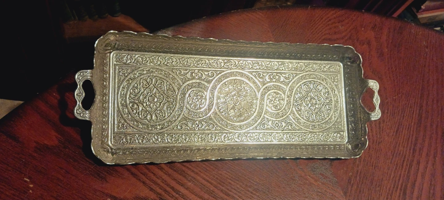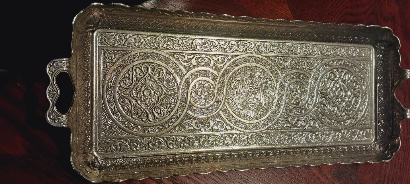 1000+Authentic Turkish Coffee/Tea Zamak Serving Tray with intricate design depicting Ottoman Motif. It has handles on either side for easy carrying. ThisTraditional Turkish Coffee Serving Tray was handmade in Turkey. Perfect for adding a touch of elegance to your home decor !! 14"×6". Excellent condition, like new !! Made in Turkey. ALL MY PRICES ARE NEGOTIABLE !!