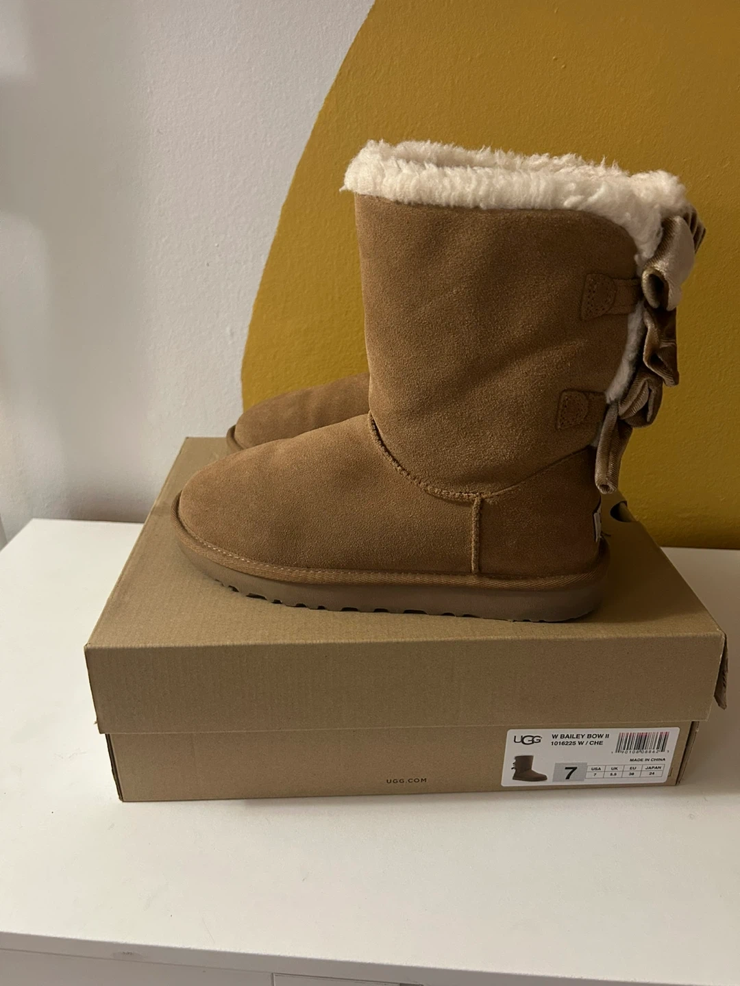 Selling a pair of UGG Bailey Bow II boots in chestnut, women's size 7! They're in great condition and come with the original box. These cozy boots are perfect for keeping your feet warm and stylish during the colder months. The adorable bow detail adds a touch of charm to any outfit