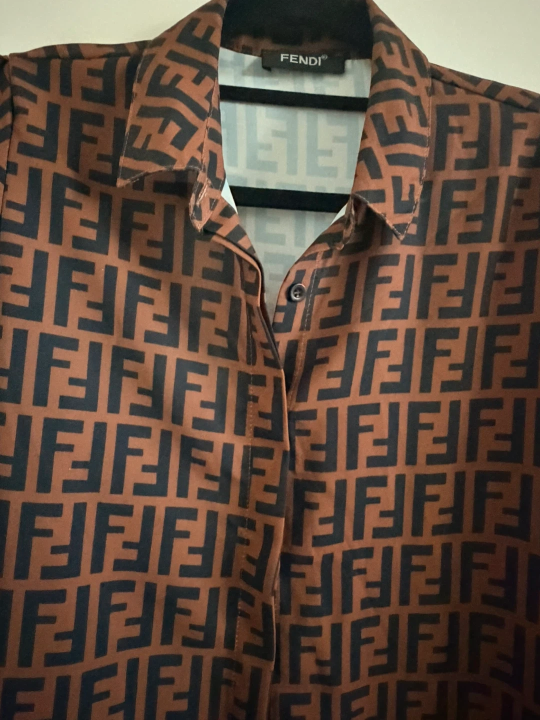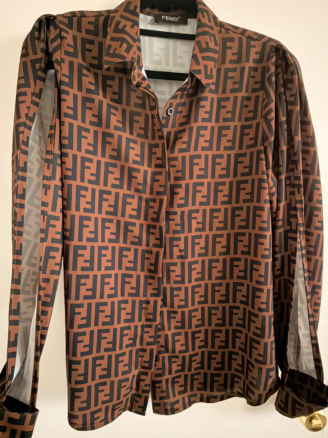 Selling a stylish Fendi blouse with a unique brown pattern. It's in great condition and ready for a new home! The blouse features the iconic Fendi design and is perfect for adding a touch of luxury to your wardrobe