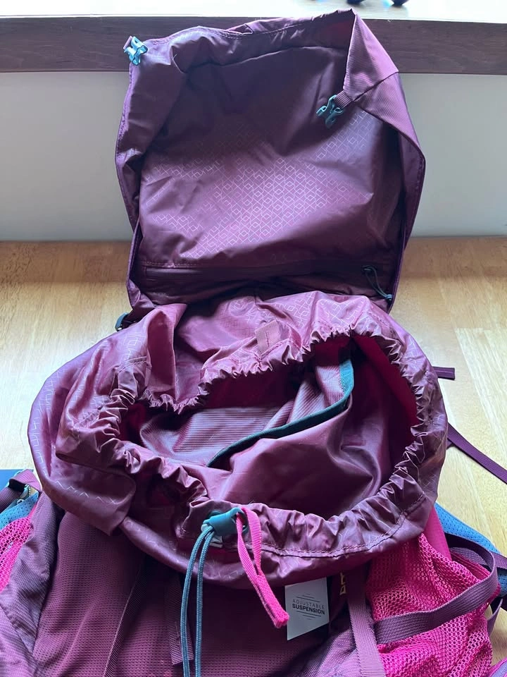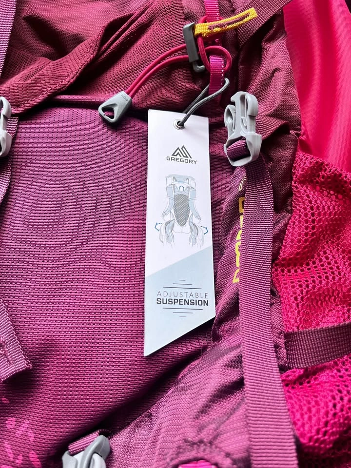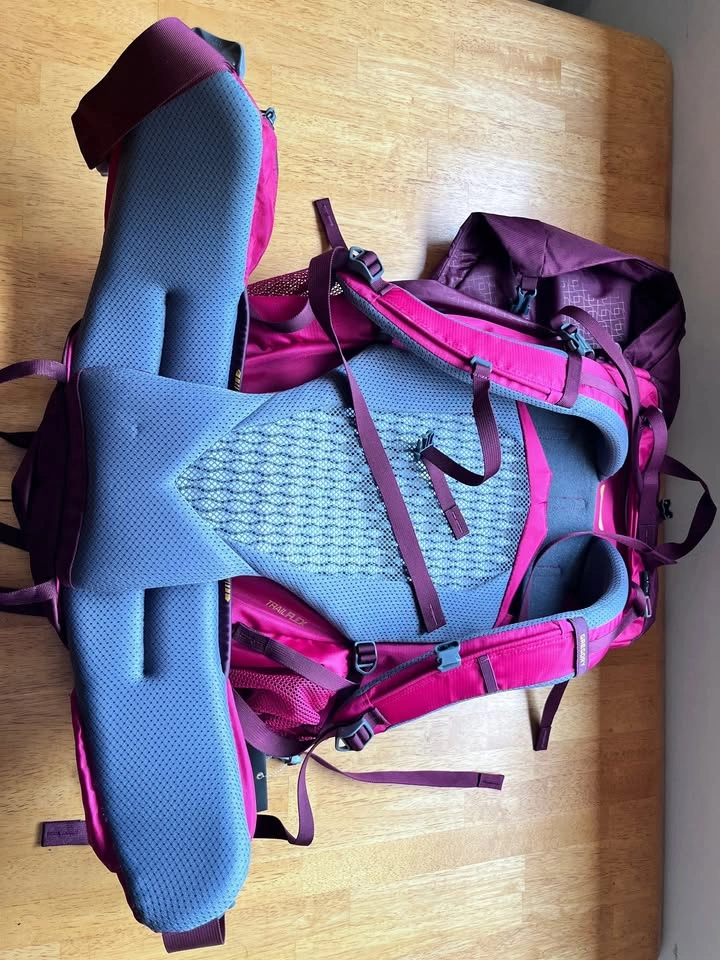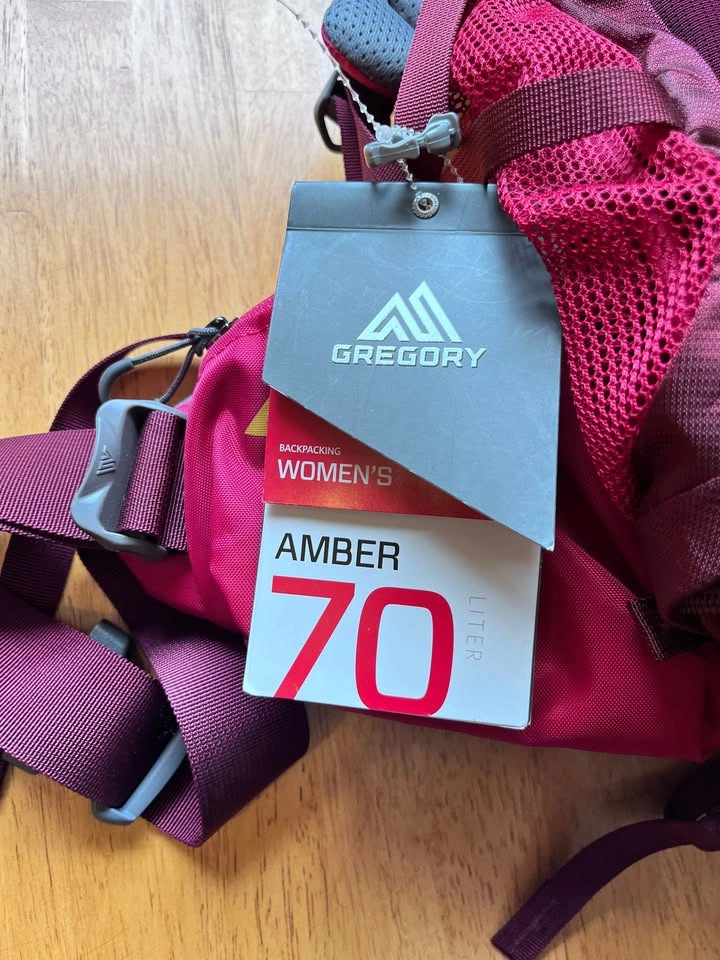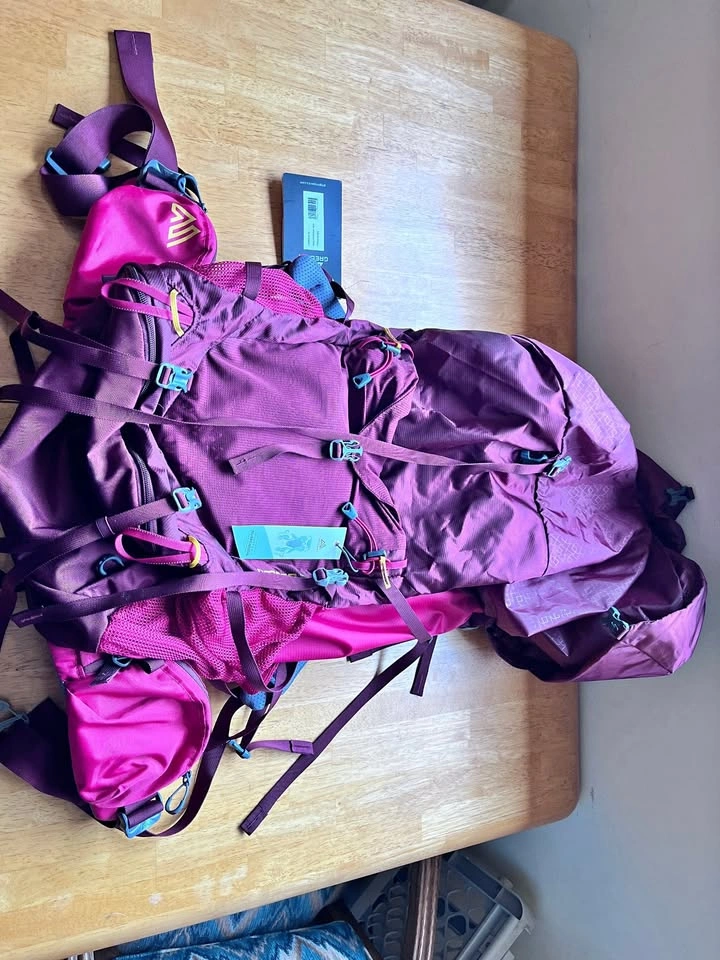 65Red Gregory women’s backpack with pocketed hip belt, sleeping bag compartment, and packable brain. 70 liter capacity on an alloy frame with hooks and loops for outside carries. New with tags.
