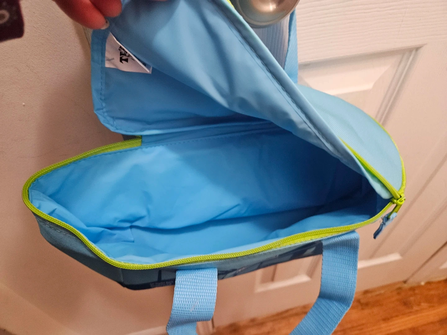 This mini blue cooler bag from Trader Joe's is perfect for lunches on the go or for carrying small items. Spot clean yo treat dirt or stains.
