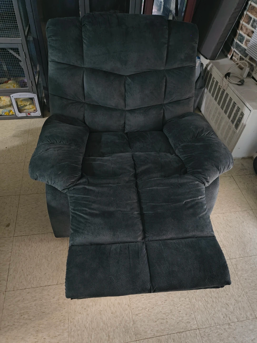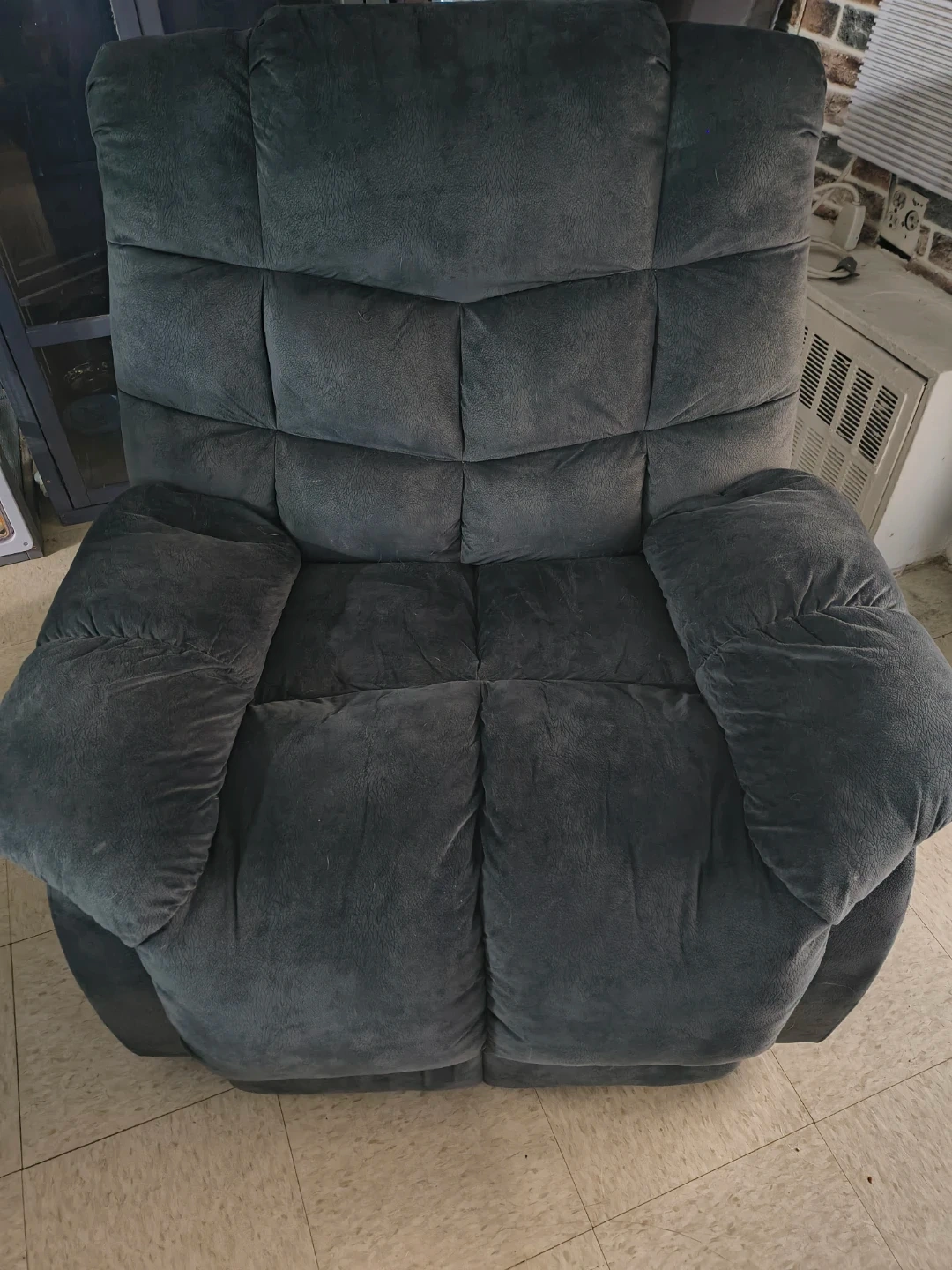 Selling a comfy gray recliner chair! It's in great shape and ready for a new home. Perfect for relaxing after a long day or just lounging around on the weekends. The material is soft and inviting, making it the ideal spot to unwind.